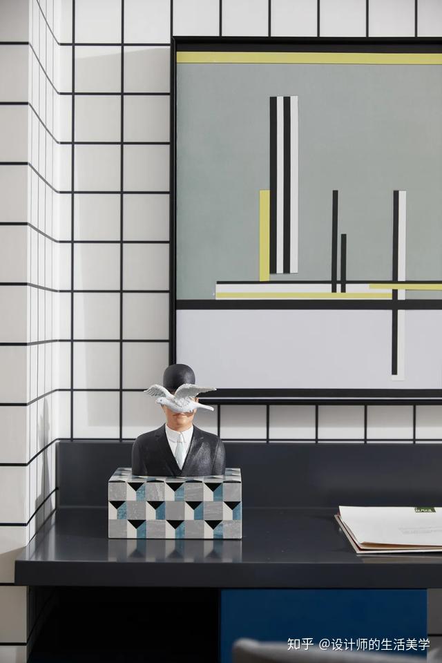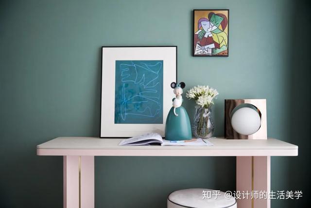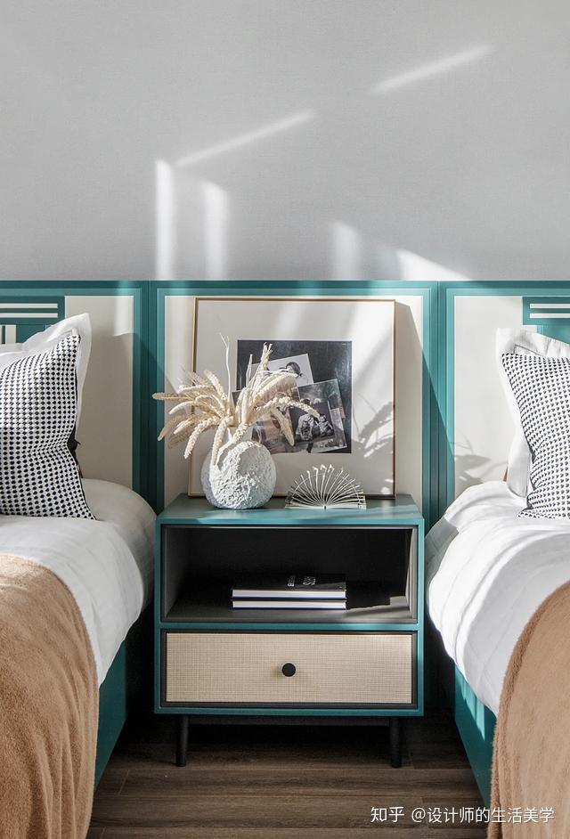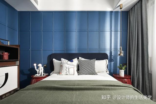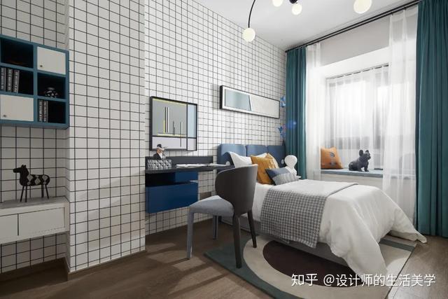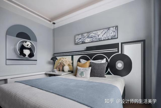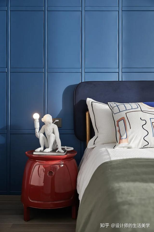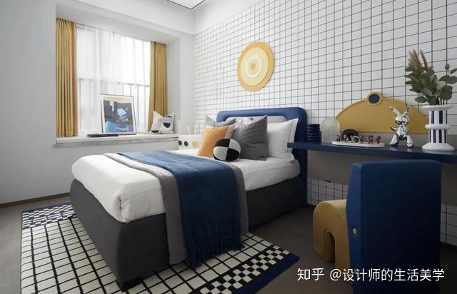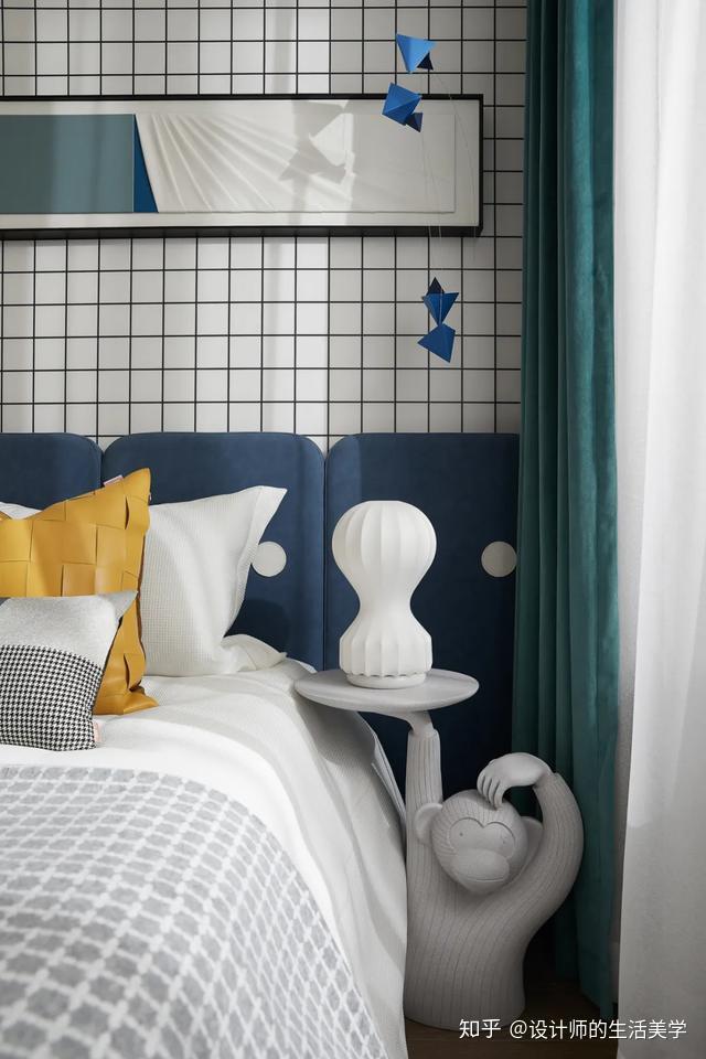 演出艺术便是告白,男生卧室以毕加索喜好且常用的蓝色彩为主,壁画、典范菱形及简洁图案的演出艺术抱枕,美感在简练的线条交织碰碰出自在的设想,缔造独有的后现代生活气氛。