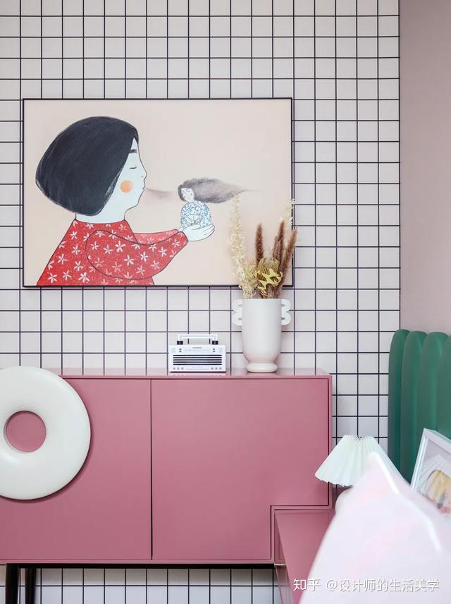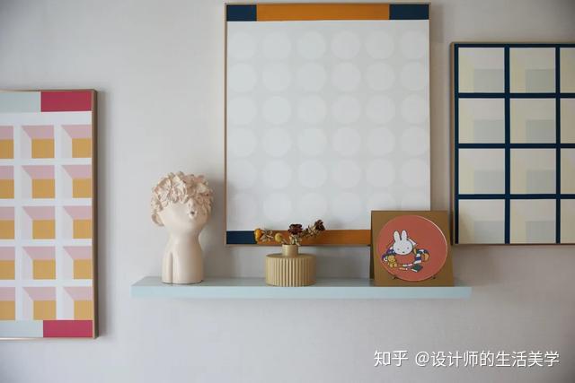 几何原素充溢内部空间。纯色的墙纸做布景,付与内部空间多元化气量。