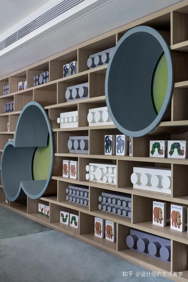 出口处的演出艺术器,引发了小孩的虚荣心。当小孩走进该内部空间,能随意坐在绿色生态的地毯上,抽出半半圆形坐椅下的书柜停止写做,恰似置身藏书楼幼儿图书室,在写做和童实的交换中收成生长。