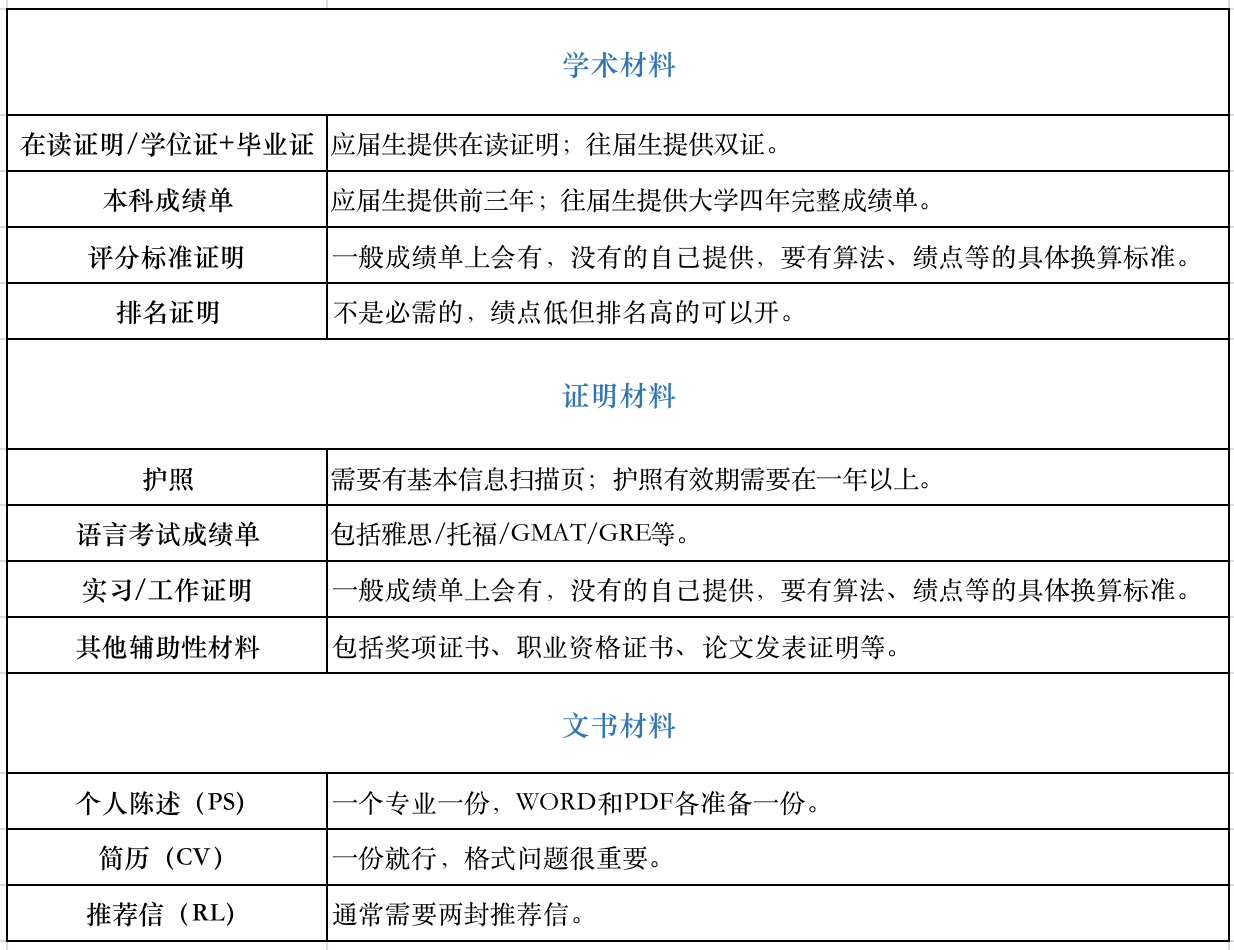 包罗一篇PS(小我陈说,一般800-1000字),一封CV(简历,有构造地枚举你的各项布景前提)和2-3封保举信(保举人能够是单元指导也能够是大学传授)。
