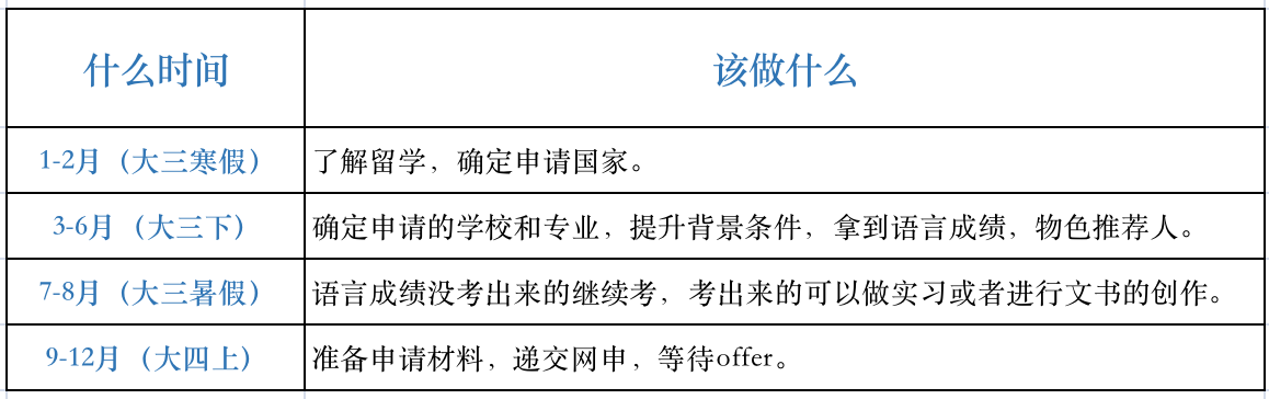 当然上述只是给各人一个参考,每小我的英语程度纷歧样,对留学的领会水平也也纷歧样,能够按照本身的情况自行调整。好比你是筹办本年申请,明年入学的学生,那如今筹办完全来得及,以至8月份之前筹办时间都还算宽裕(但是不建议那么晚,项目满额就会封闭申请)。