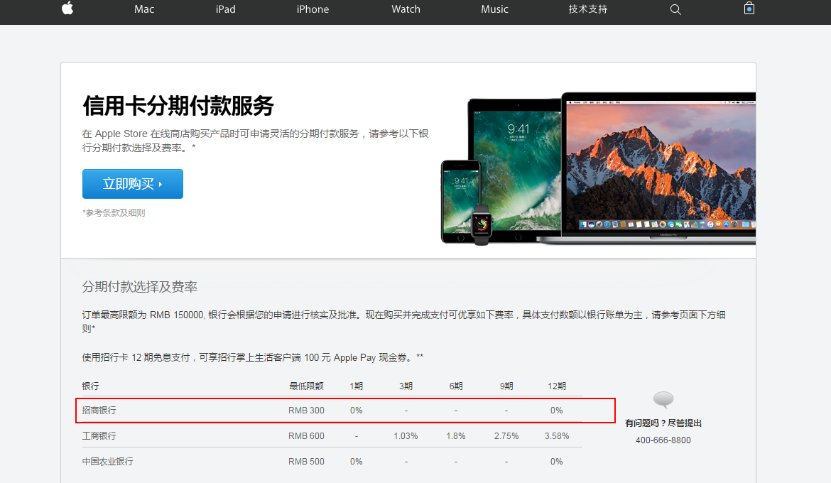 只好,我又进入了苹果公司官方网站一探事实,辨认出却是招商贸易银行较为可相信,商品是来源于官方网站的,同时又享受12期分期付款付款,是为“赞”。