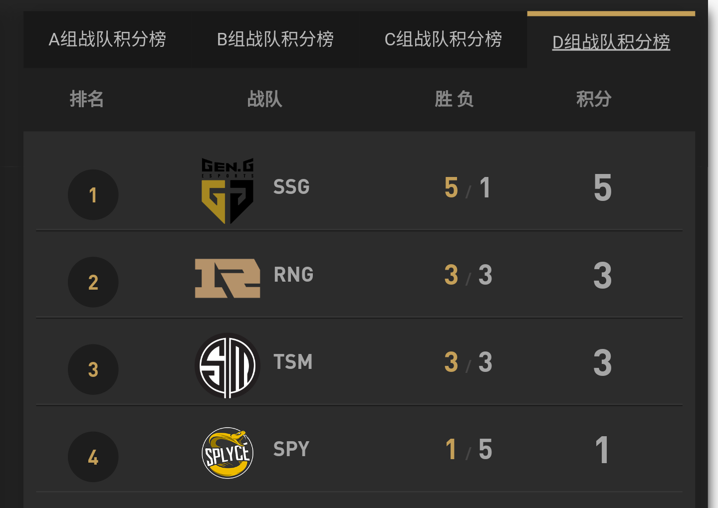D组RNG 对 T** 两轮主客场不败,所以不消打加赛。T**(NA分赛区一号种子),第二轮,打赢了SSG(LCK分赛区三号种子),但是两轮全输 RNG,RNG 小组第二晋身。