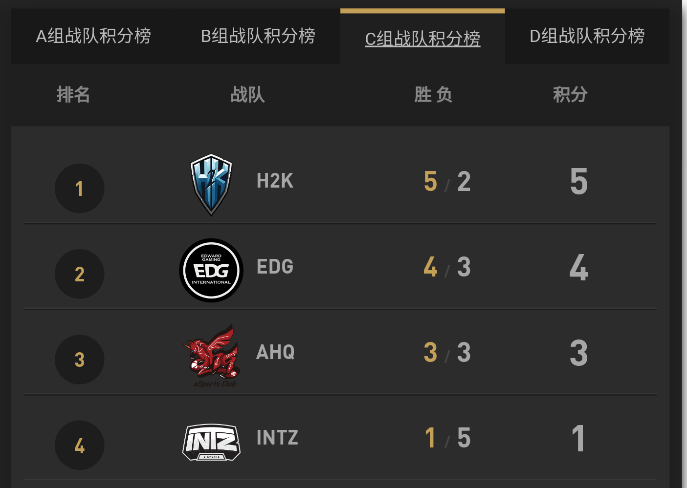 C组EDG 和 H2K 抢一,输了,那代表他们肯定碰着其他分区头名的三只韩国队的此中一收