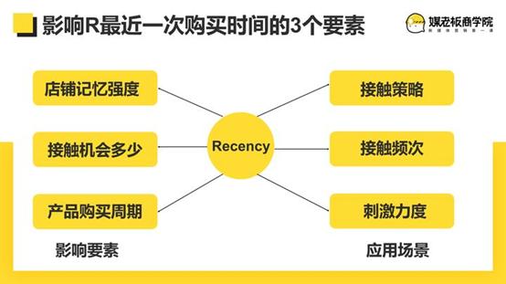 先来看R(比来消费时间),影响R比来一次购置时间的3个要素:店铺记忆强度,接触时机几,产物购置周期。关于近期没有消费的客户,我们通过差别的接触战略,接触频次和刺激力度来影响和维护客户。