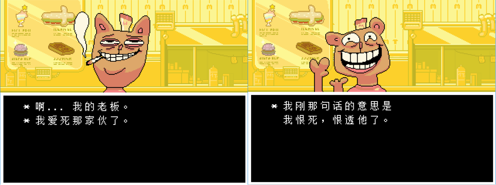 PS:那个和Chara旁白论其实不矛盾,因为在搏斗结局末尾,Chara会独立出来和玩家停止互动,和OFF里面玩家把持的Batter类似。Batter在游戏停止的时候,也会对各类工具做出或是不屑,或是调皮的评论。