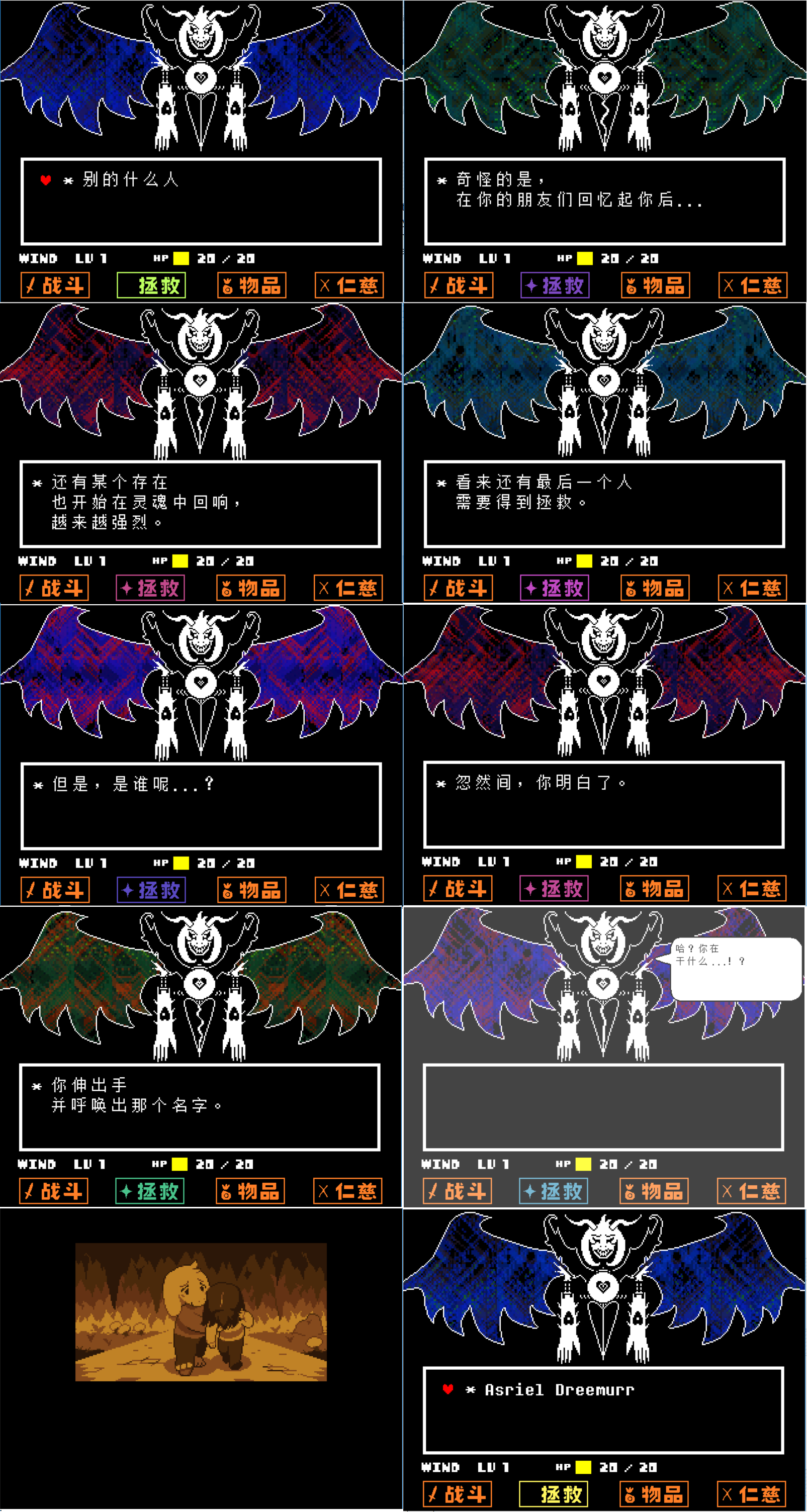 而当它变回Asriel之后,又会申明他持续骚扰配角的原因是他们会是独一理解他的人,也是独一让他感应兴趣的存在。同时威胁玩家会“将会死在一个没有人记得他们的世界”。