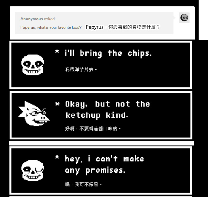 在官方访谈ASK里头,Sans筹算带薯片;固然说是游戏本体外的正式访谈,但是我们也能够合理认为Sans还有其他买薯片的路子。
