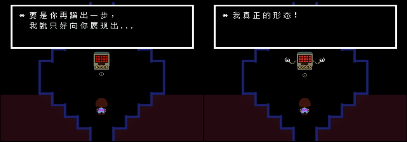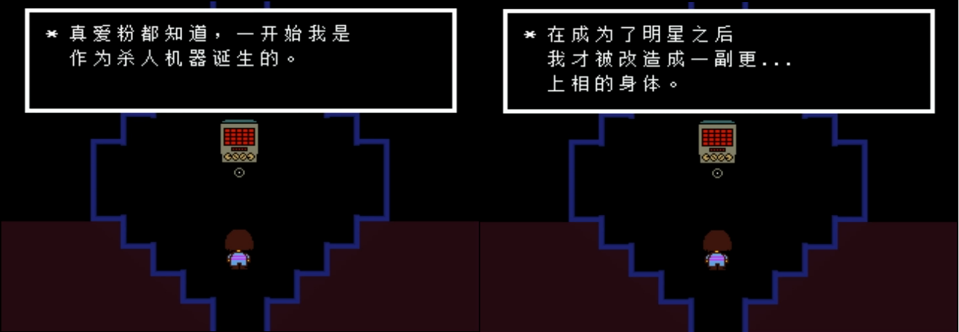 那里留意一下,之前的电视节目和海报里呈现的都是Mettaton盒子。然后,当玩家仍然一意孤行,Mettaton就会提到本身要用“实在的形态”来阻遏你。
