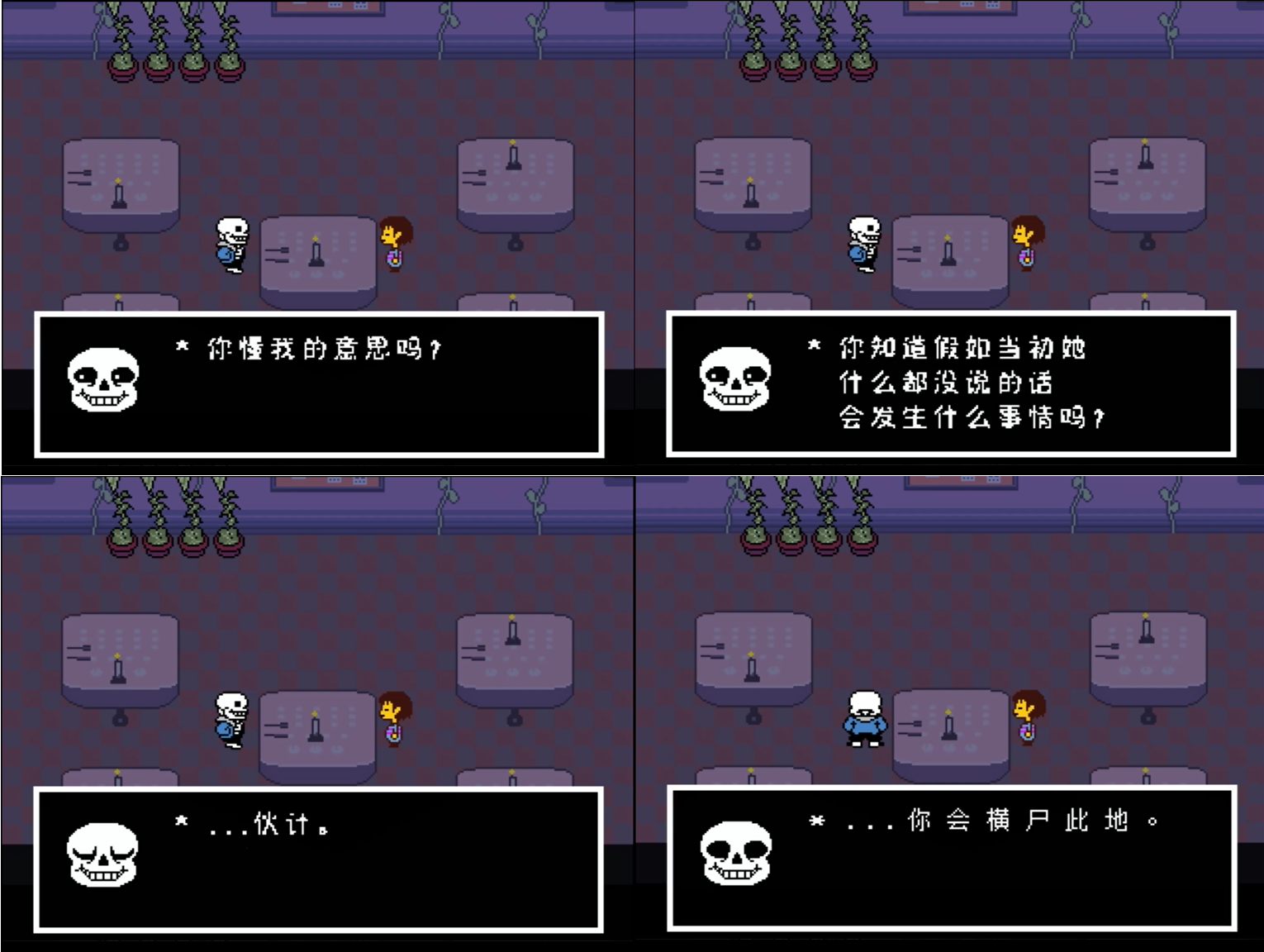 即便那时候你没有任何EXP,LV也仍是1,没有拿走多于一块的怪物糖果,没有勇闯十次地下室,没有给雪鸭喝倒彩……总而言之,根本上一路什么坏事都没有做,那段“横尸此地”的台词照样不会缺席。可见,Sans关于玩家存在必然的歹意,至于原因,在搏斗线路可能能够表现: