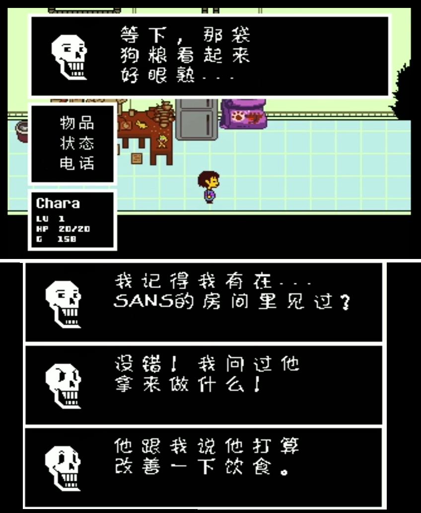 Sans帮Alphys买了大包拆的狗粮,可能是交融怪Endogeny的食物。若是在Lab给Papyrus打德律风,打到第二通的时候,就会得到如上的德律风;可见,Lab里头的狗粮是Sans帮Alphys买的。并且那侧面也可能申明,Sans晓得实在验室和交融怪们的存在。