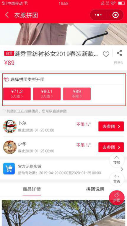 情景事例:王蜜斯参与店面的拼团公益活动,看到三种拼团贸易形式,王蜜斯焦急购置货品,优先选择了三人拼团,转发老友拼成后,胜利购置货品。
