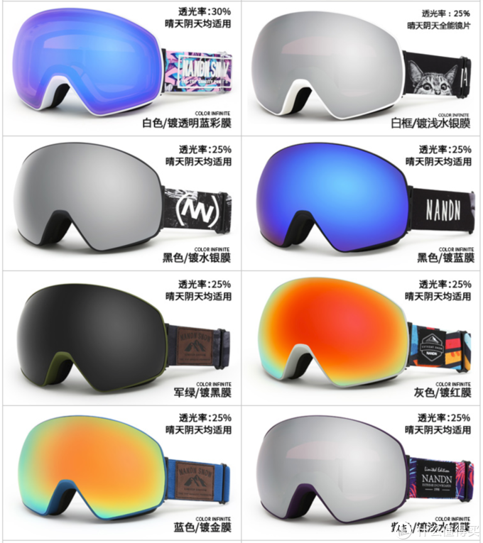 买的时候不要只顾着买最亮丽的镜片颜色,那里有一个透光率的优先选择。透光率越低,越像墨镜,太阳背山的时候容易看不清滑雪板。老纪小我建议买透光率高许多的,较为百搭,固然阳光最足的时候可能有点儿扎眼,但是不消担忧UV,一样会被过滤掉。