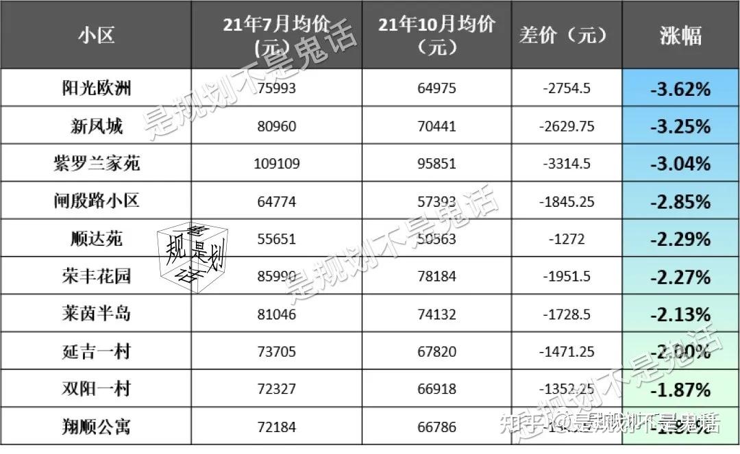【杨浦区涨幅后10排行榜】@鬼话宝于是我们将杨浦区的6594个小区,从2021年7月至2021年10月的房价涨跌幅,也落在了地图上,试图找出此中的规律: