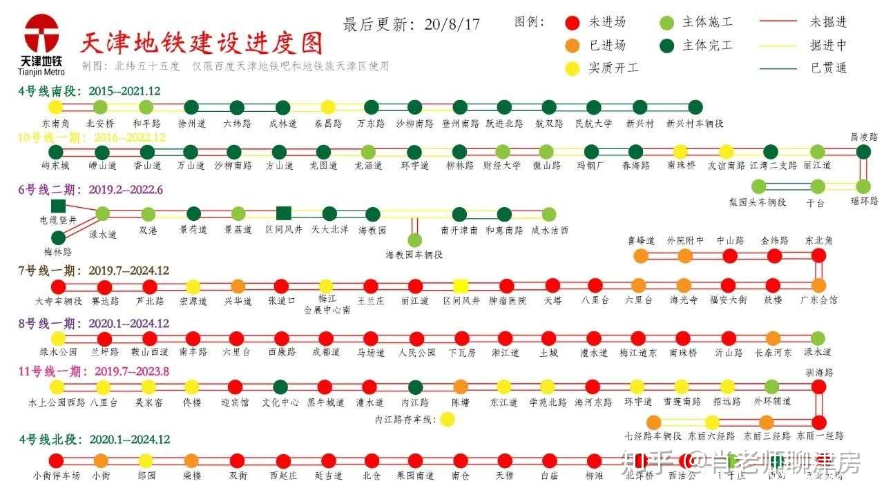 关于天津地铁,如今运行的线路图如下图所示,还有在建立进度图,第三图是将来规划图,固然都完全建成运营的时间会长点,但是总没有强。记住买房分别地铁站太远(不叫地铁房),也不克不及太近(太吵影响栖身),500-800米更佳。