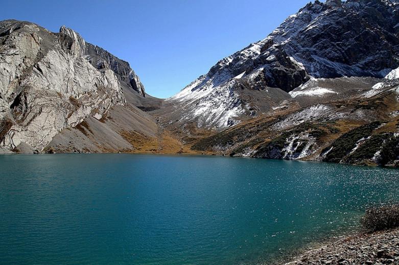 源海西南处四公里,沿着则查洼沟的山谷步行而上,翻过一个低矮的垭口,就能看到像宝石般镶嵌在则查洼沟十字路口的则藏海