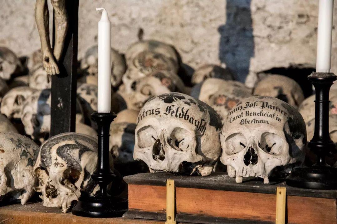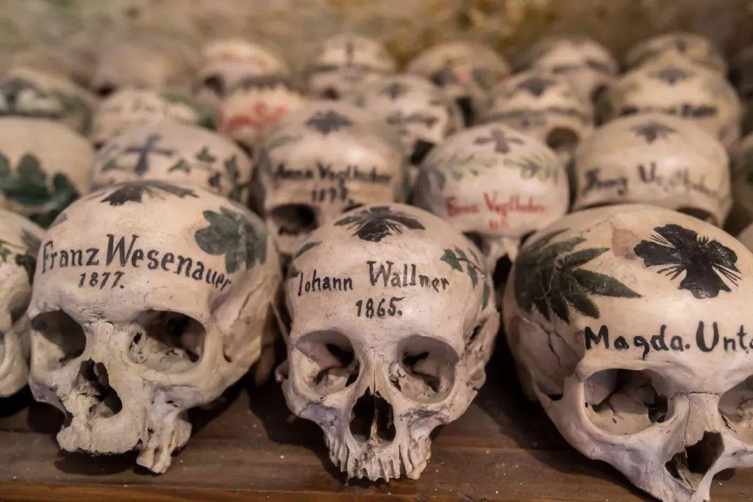刻上姓名和生卒年月的头骨被堆叠在一路
