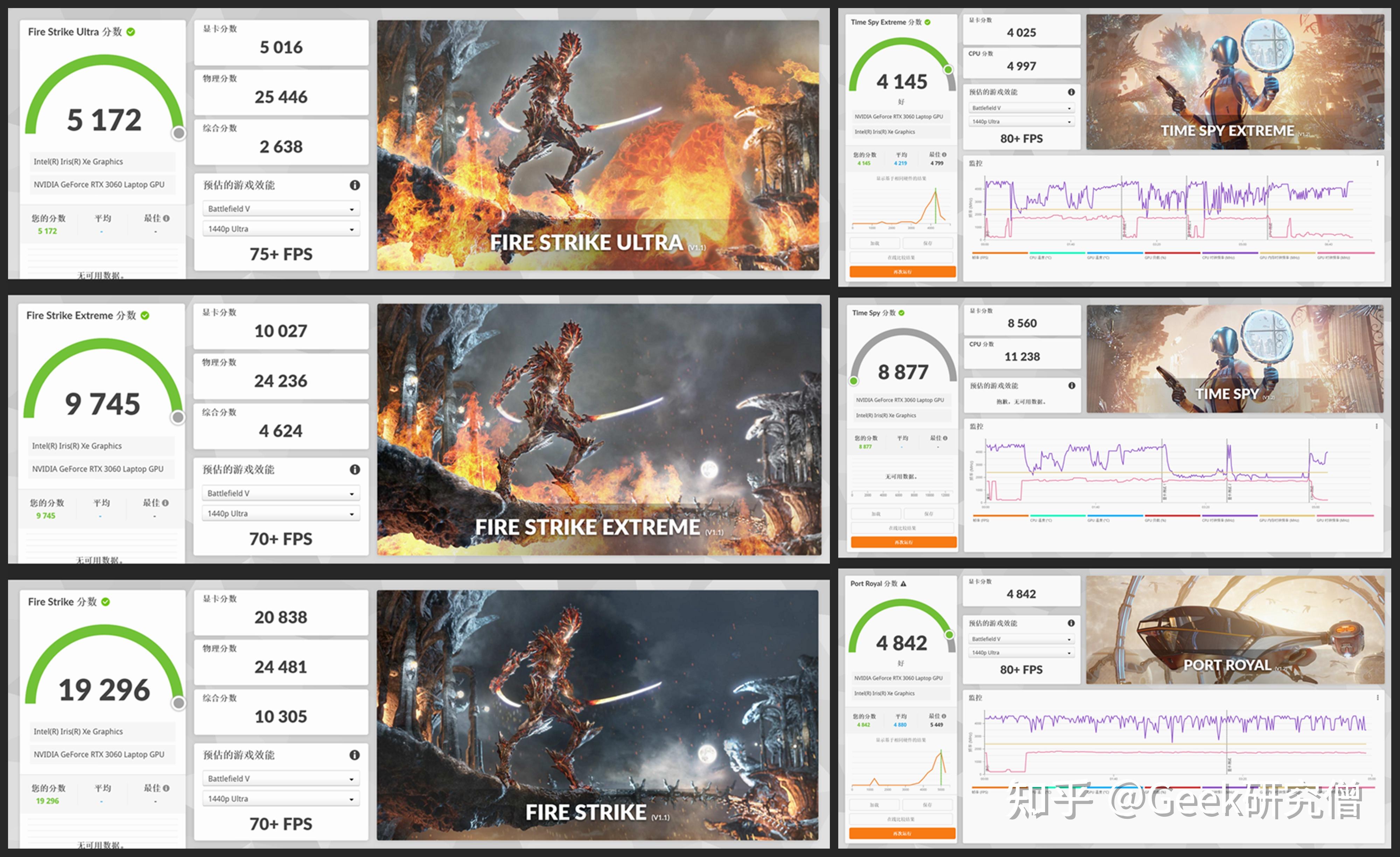 通过 3DMark 测试能看到 RTX 3050 Ti 在 Time Spy (DX12) 测试总分 8877 分,傍边显示卡得分 8560 分;在 Fire Strike (DX11) 测试总分 19296 分,傍边显示卡得分 15263 分;Port Royal(光逃)测试总分 4842 分。