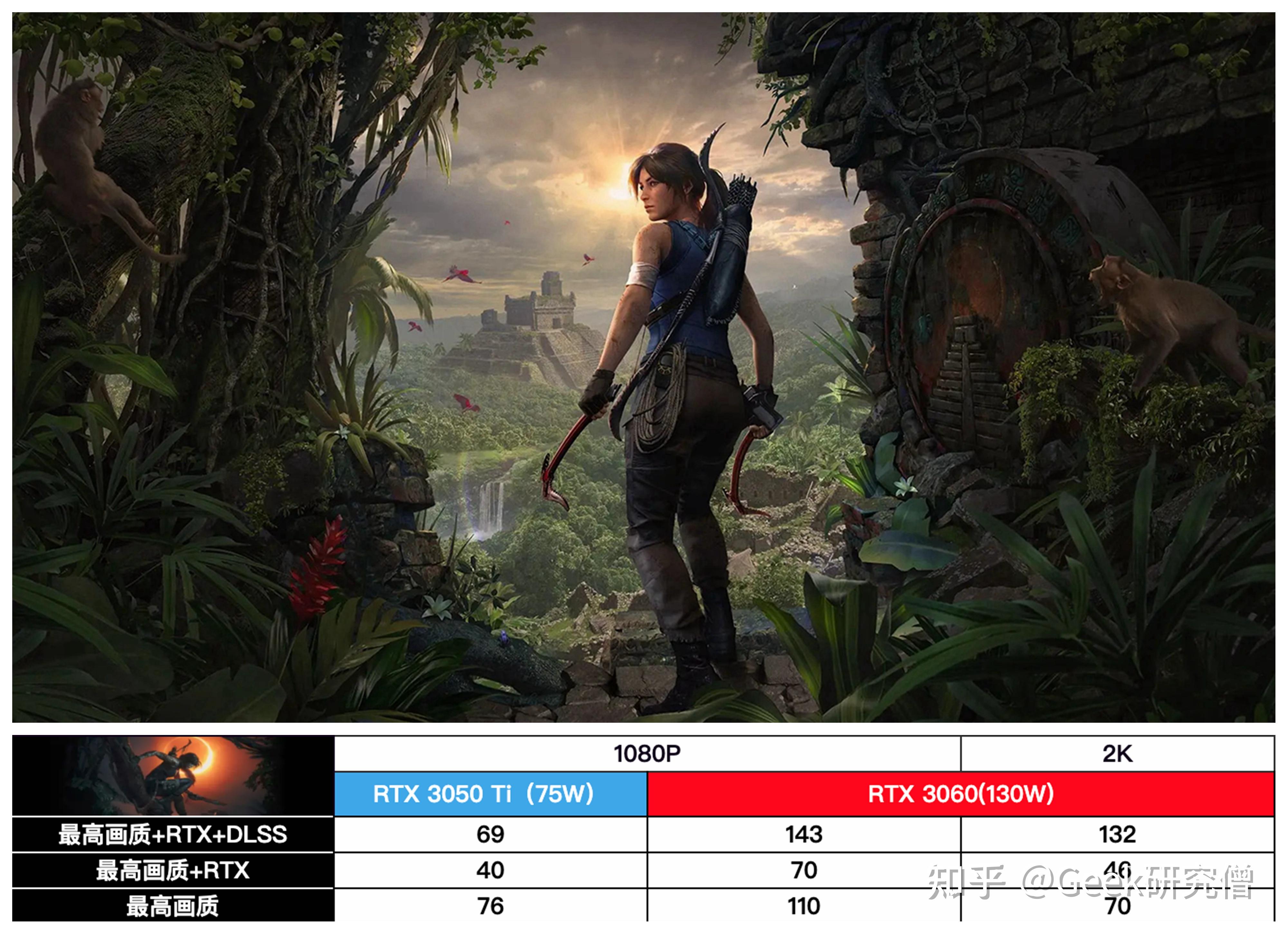 ▼《古墓丽影:阴影》,2K 分辩率下开启光逃和DLSS 后,帧率乘以 3 倍,相当给力。