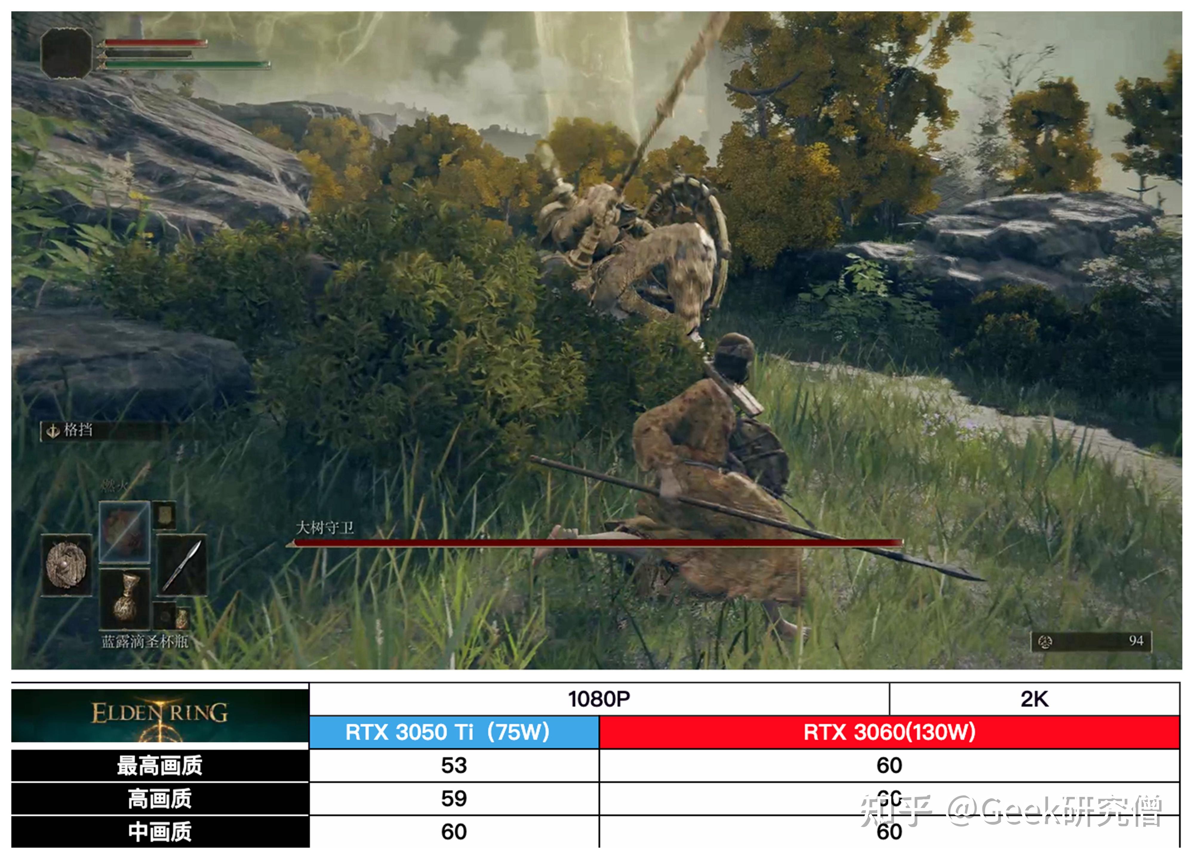 ▼《艾尔登法环》,RTX 3060 根本上无压力满帧运行,RTX 3050 Ti 在高画量下略低,但是总体流利。