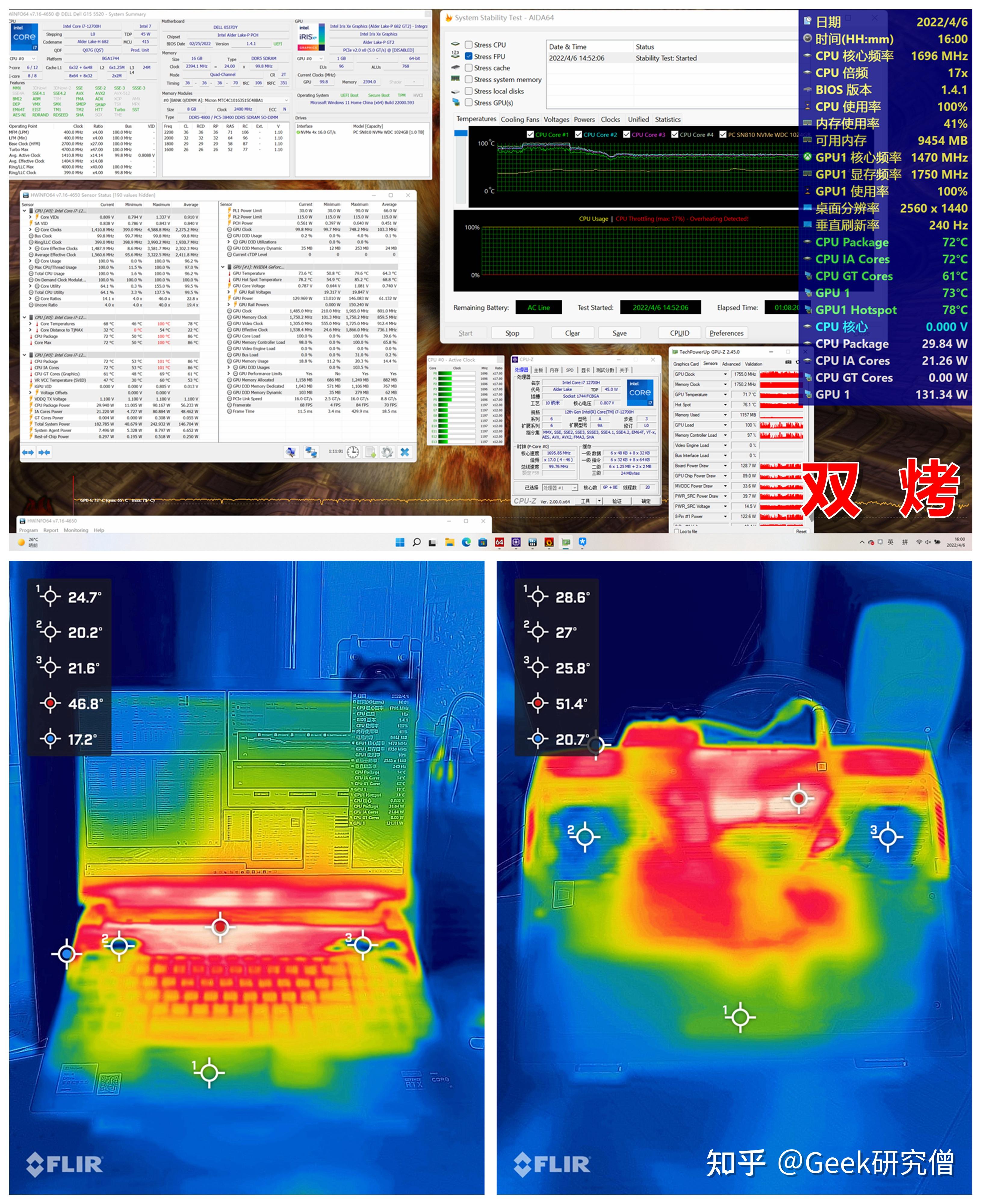 接下来测试的是 30 分钟的 AIDA64 FPU + FurMark「双烤测试」 ,能看到 CPU 功耗不变在 21.26W,主频为 1.696GHz,傍边 P 核频次为 1.696GHz,E 核频次为 1.197GHz,温度为 72℃。而 GPU 的温度为 73℃,频次为 1470.0MHz,功耗为 131.34W。此时 CPU + GPU 的总功耗为 152.6W 以内。在外壳温度方面,C 面更高温度为 46.8℃,D 面更高温度为 51.4℃,比单烤 CPU 高,但低于单烤 FPU。