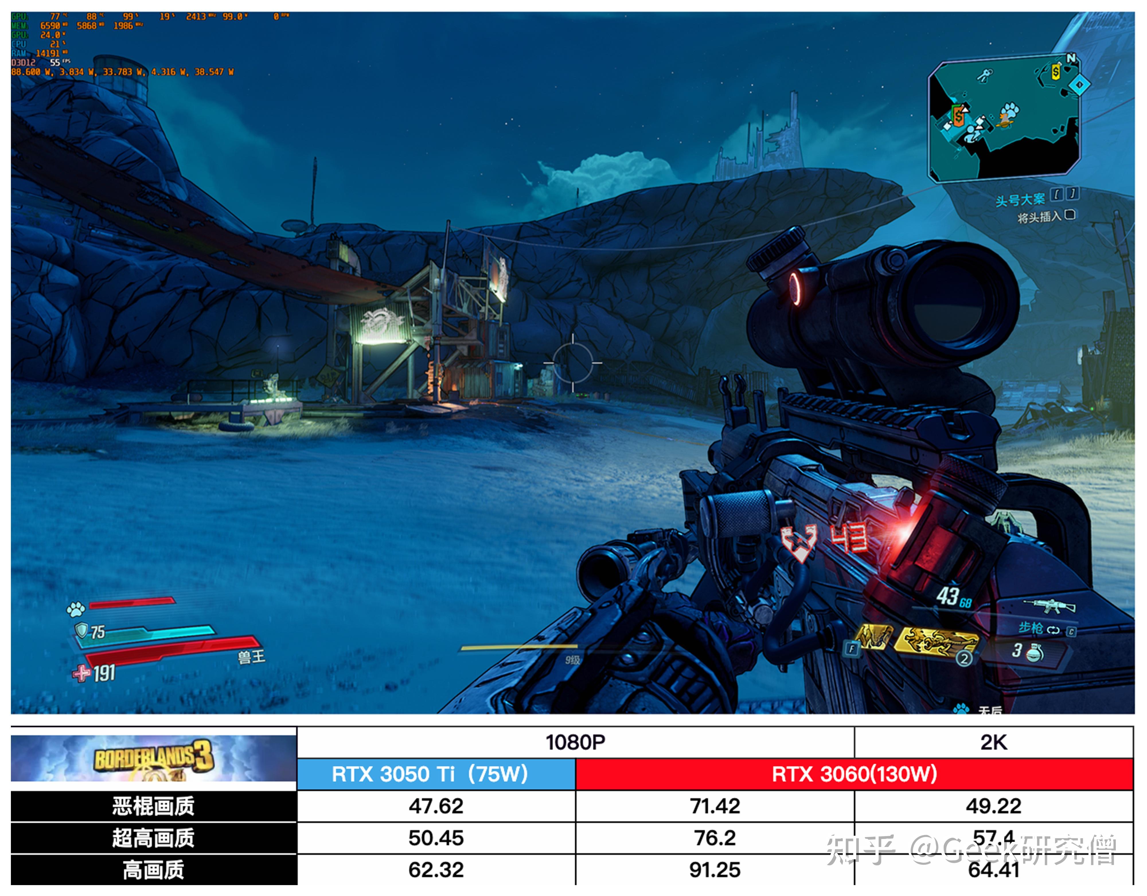 ▼ 《无主之地 3》,RTX 3050 Ti 和 RTX 3060 别离在高画量和恶棍画量可以满足 60fps 的要求。