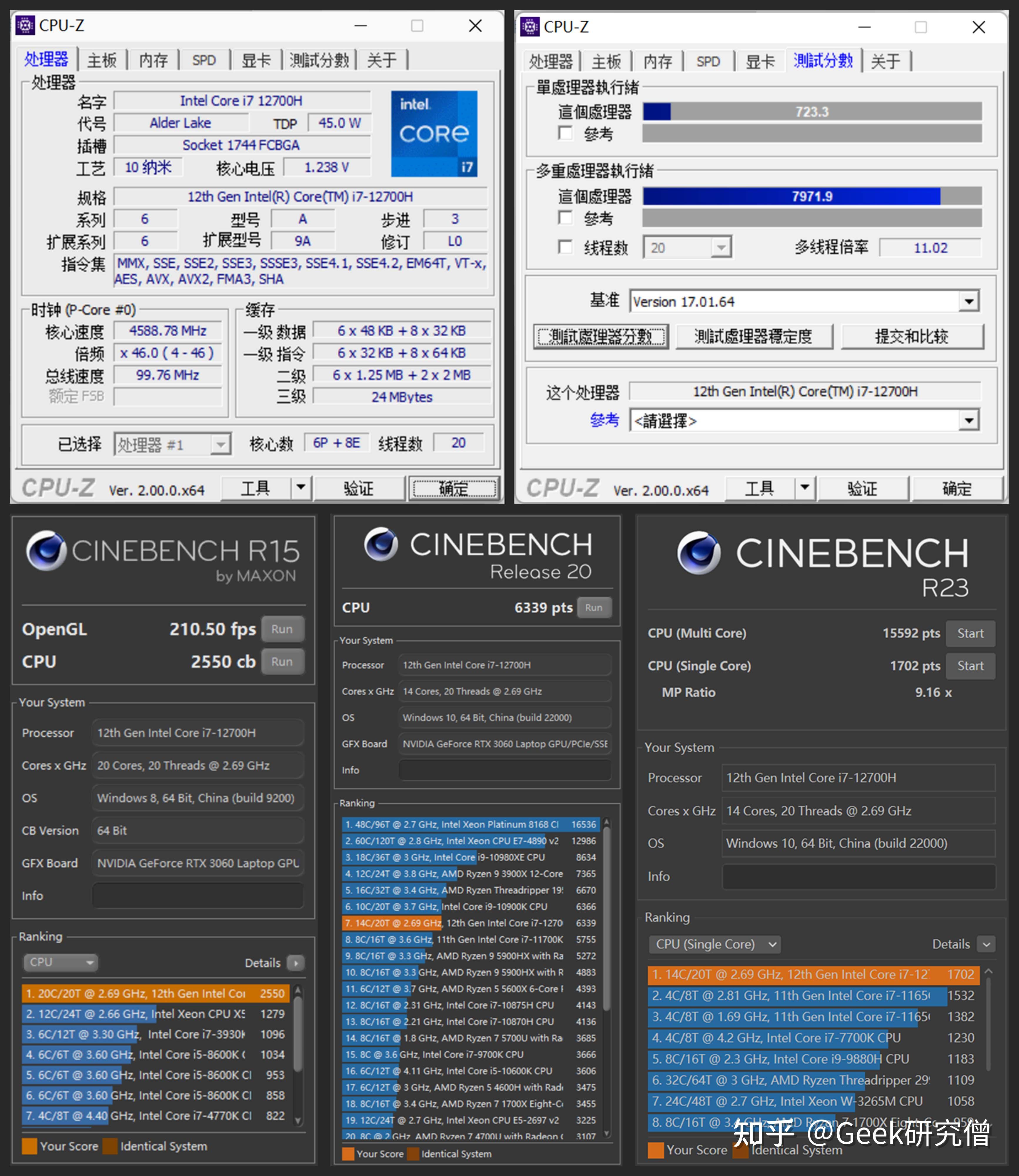 从现实的测试来看,CPU-Z 单核性能得分 723.3 分,多核性能 7971.9 分。CINEBENCH R15 测试中,CPU 性能为 2550cb;CINEBENCH R20 测试中,CPU 性能为 6339pts;CINEBENCH R23 测试中,单核性能得分 1702pts,多核性能得分 15592pts。