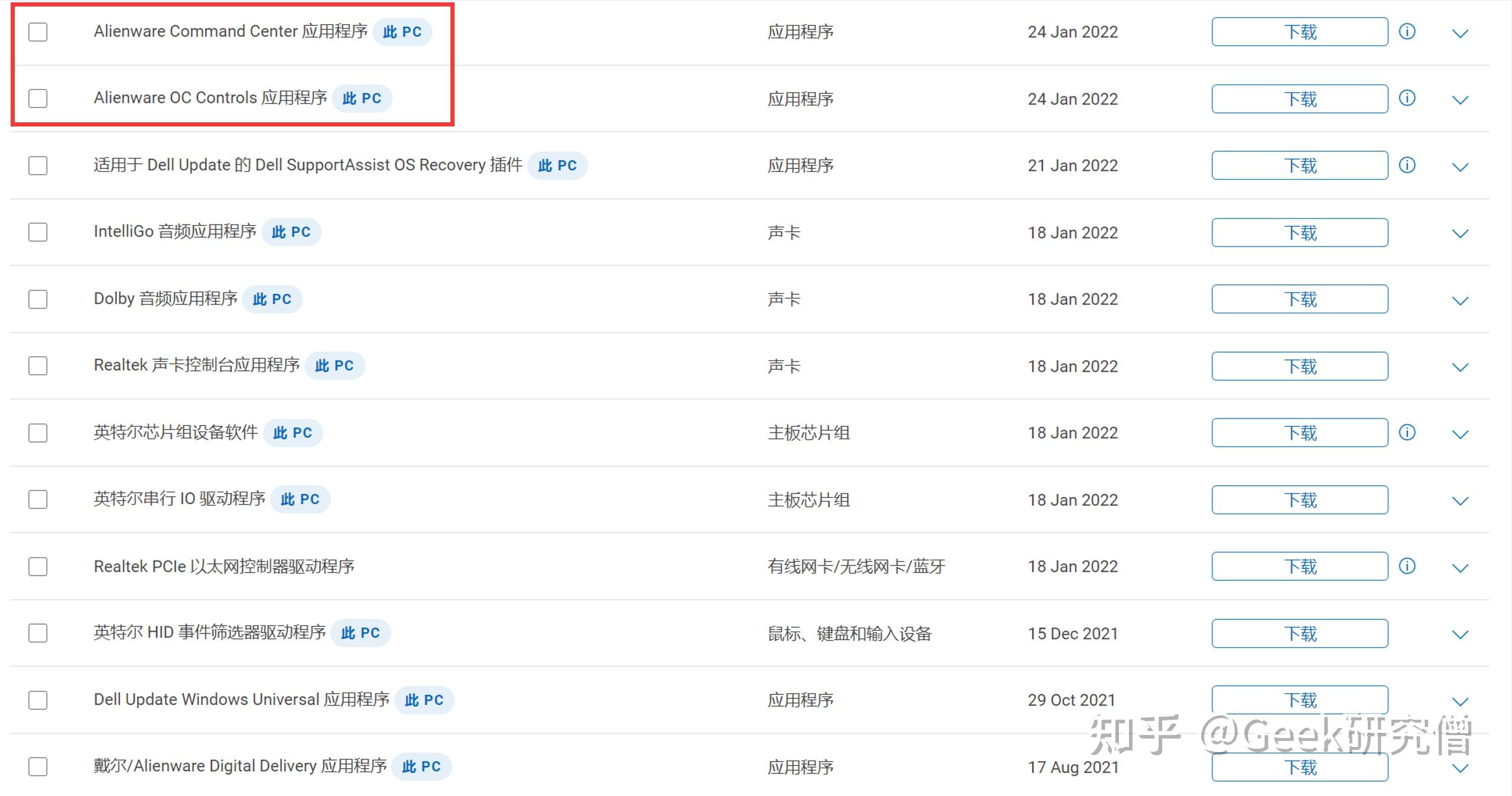 我建议我们优先下载「Alienware Command Center」和「Alienware OC Controls」,那两项软件会涉及到电脑的一键 G 形式——高性能形式。其他驱动和应用我建议根据后面的法子自行下载,即便此处纷歧定是最新的。