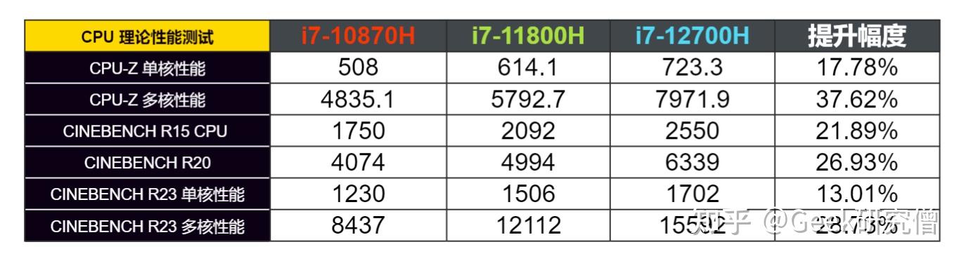 我拉取了 i7-10870H 和 i7-11800H 的测试数据,比照之下,能看到 i7-12700H 在单核性能的提拔高达 13-17%,多核性能提拔以至到达了 27-37%,提拔幅度较大。