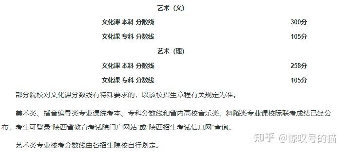 部门院校对文化课分数线有特殊要求的,以该校招生章程有关规定为准。美术类、播音编导类专业课统考本、专科分数线和省内高校音乐类、跳舞类专业课校际联考成就已经公布,考生可登录“陕西省教育测验院门户网站”或“陕西招生测验信息网”查询。非美术、播音编导类的省外院校专业课分数线由各招生院校规定。