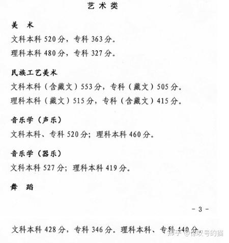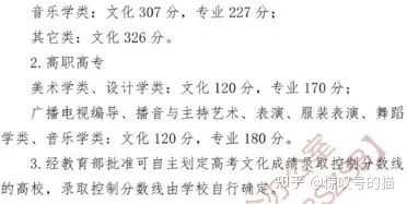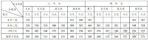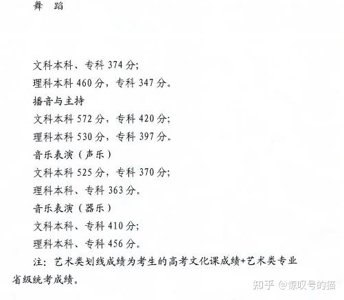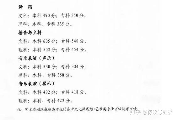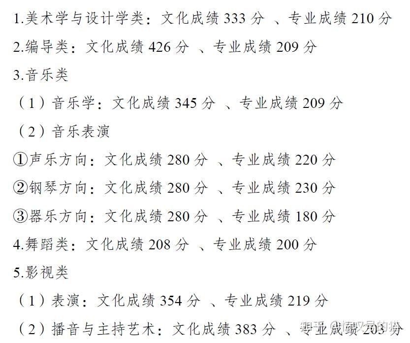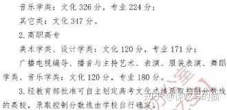美术与设想学类、音乐学类(声乐)、音乐学类(器乐)、跳舞学类、演出等专业本科文化线:330分;