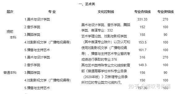 艺术类专业的登科由文化分数线和艺术统考分数线双线控造,各批次的登科更低控造分数线别离为: