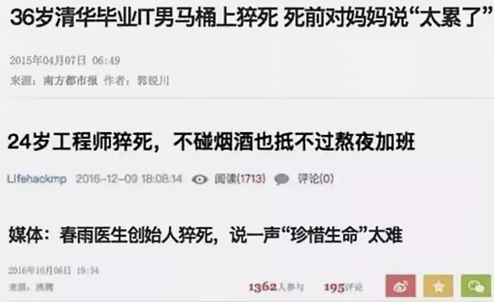 当过劳心脏病发一再发作,人们渐渐会觉得那很一般,下班时间无底线后延,最末所有职业都成了高危工做,上班有可能丧命。