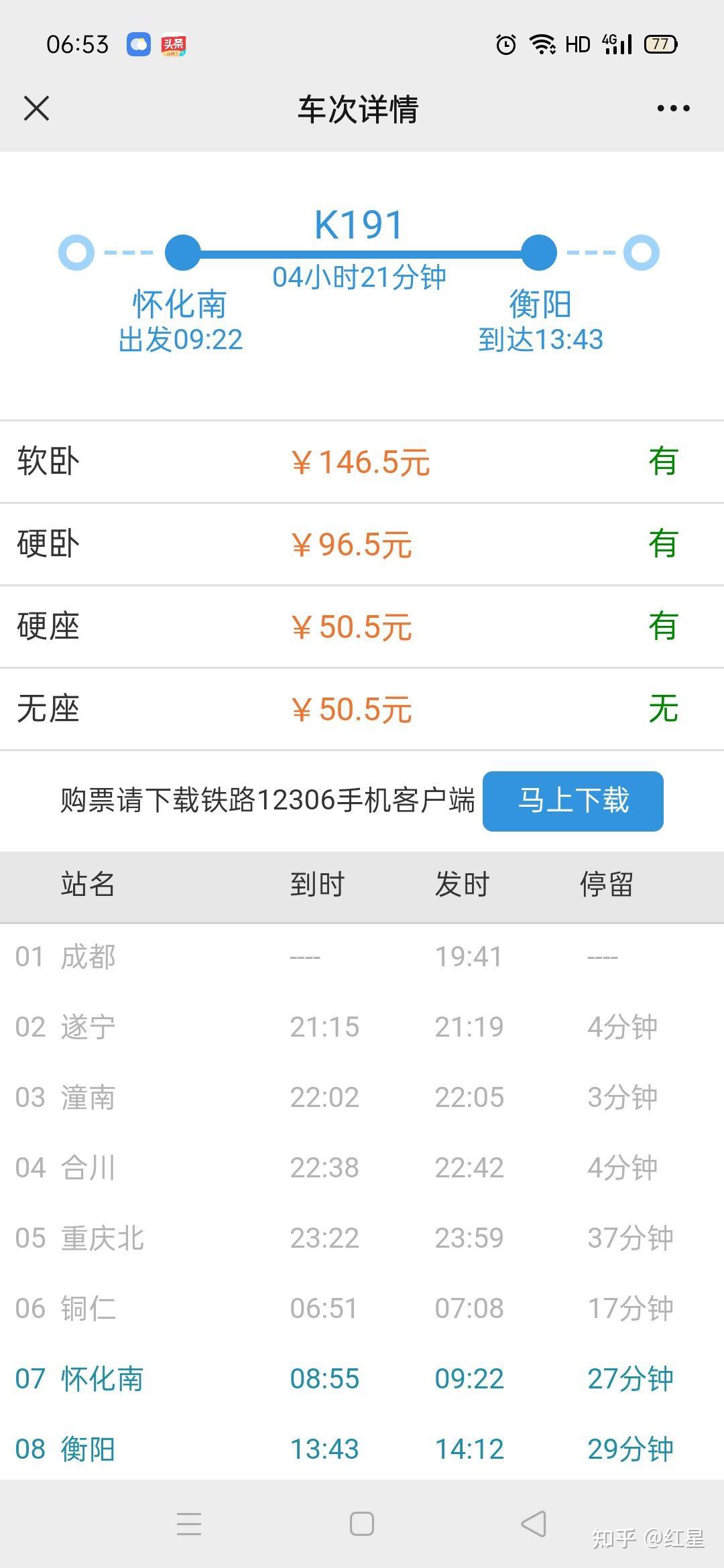 在邵阳北站,搭乘K191次 ( 成都-广州 ) ,上午9:22驾车,下战书13:43抵达长沙站,用时4小时21分钟,硬卧发布车资50 . 5元 ( 团体票折扣价50%是25元 ) ;