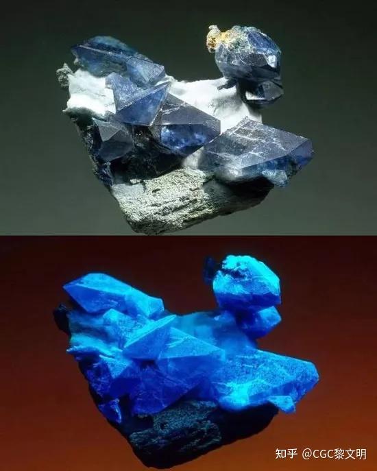 右图是全唇兰原石(图片下半部门是短波紫外线之下:呈现出亮红色-蓝白色的荧光)