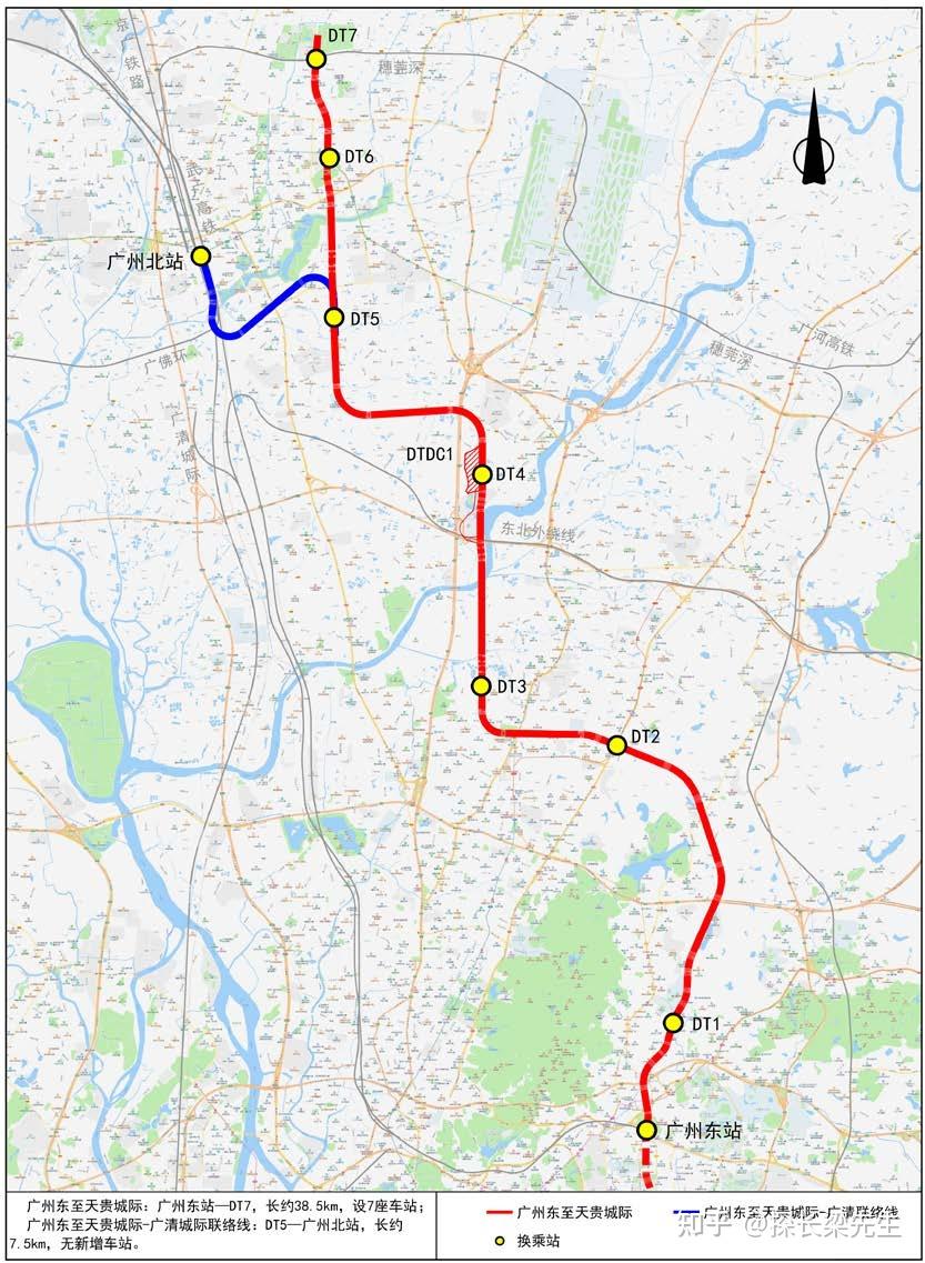 18号线北延段(广州东至天贵城际)包罗主线和联络线,主线为广州东站至天贵路,长约38.5公里,设7座车站,联络线为凤凰南路(DT5)至广州北站,长7.5公里,无新增车站。线路所有站点均为换乘站,可换乘多条已开通和规划中的地铁线路,以及在建的城际铁路。