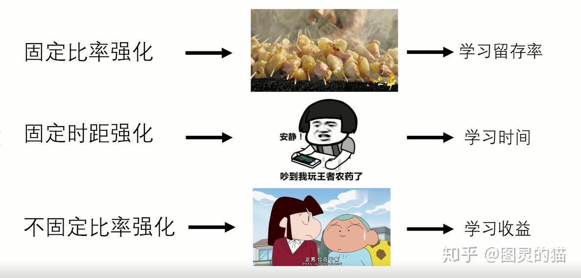 “固定比率强化”(Fixed Ratio),好比说“打败10个哥布林必然能升1级”,“连胜10场必然能升段”;“固按时距强化”(Fixed Interval),好比说“《皇室战争》里的白银宝箱3小时后必然能解锁”;“不固定比率强化”(Variable Ratio),也就是“《阴阳师》每抽一场卡,有1%的几率抽到SSR”。那三套办法,将强化自学中的不确定性奖赏,固化成为确定性收益,好比说分数、卡牌。