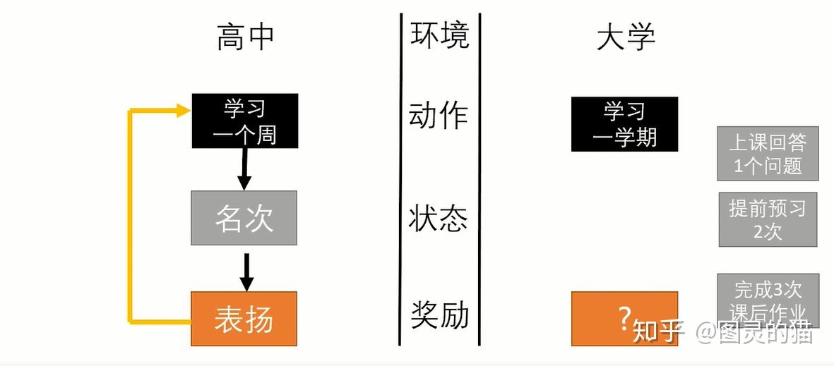 在如许的定见反应电路中,“姿势”带来的“奖赏”被极大加速,整个系统变得完全正向。上了大学以后,认实自学两个学期,才气有两个好的GPA,那个定见反应周期变长了几倍,并且也很少有人因为GPA遭到表彰,因而,大大都人对峙不来。取而代之的,许多人习惯测验前1个周起头施行“自学”姿势,因为只需要1个周就能获得相当可不雅“奖赏”,好比说及格。所以,想法子削减你的定见反应周期,好比说,将大目的合成为小目的,会更容易塑造两个持续的电路