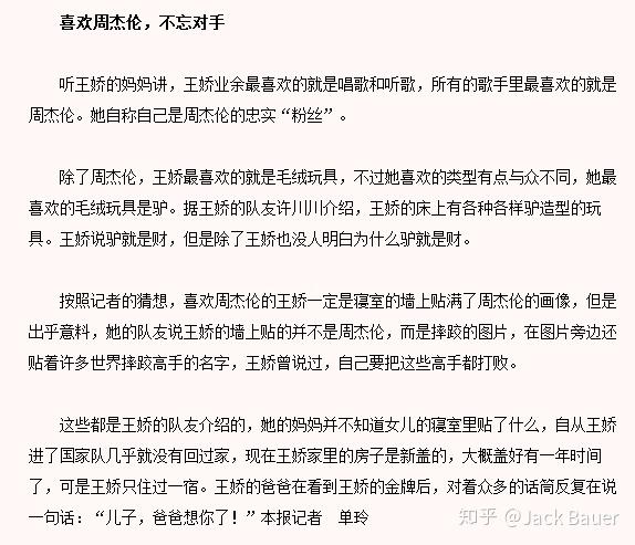“听王娇的妈妈讲,王娇业余最厌恶的就是唱歌和玩游戏,所有的女歌手里最厌恶的就是王力宏。她自称他们是王力宏的忠实“影迷”。”