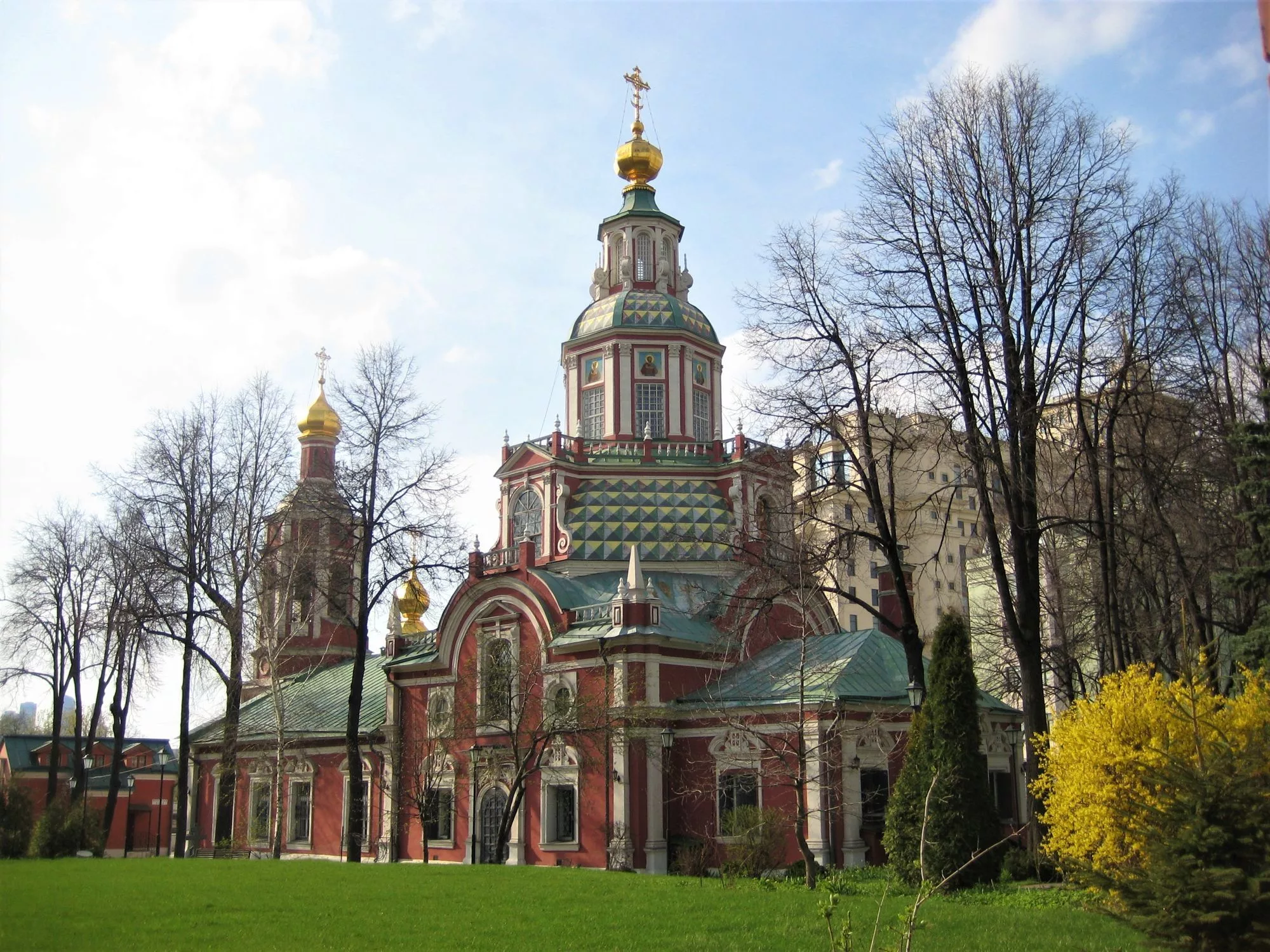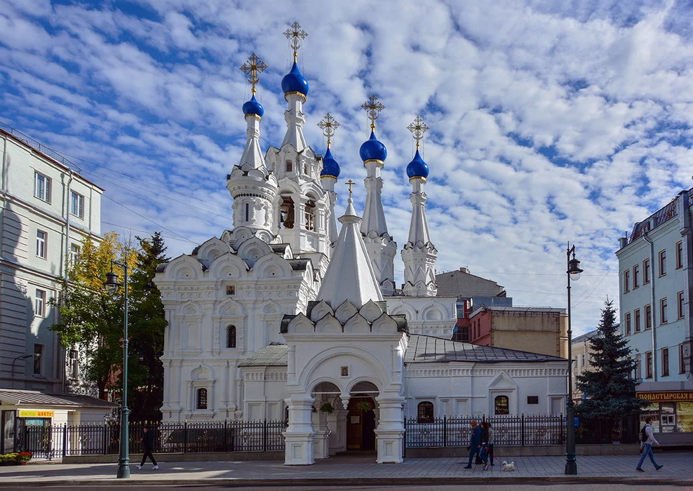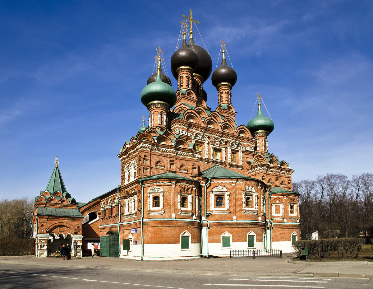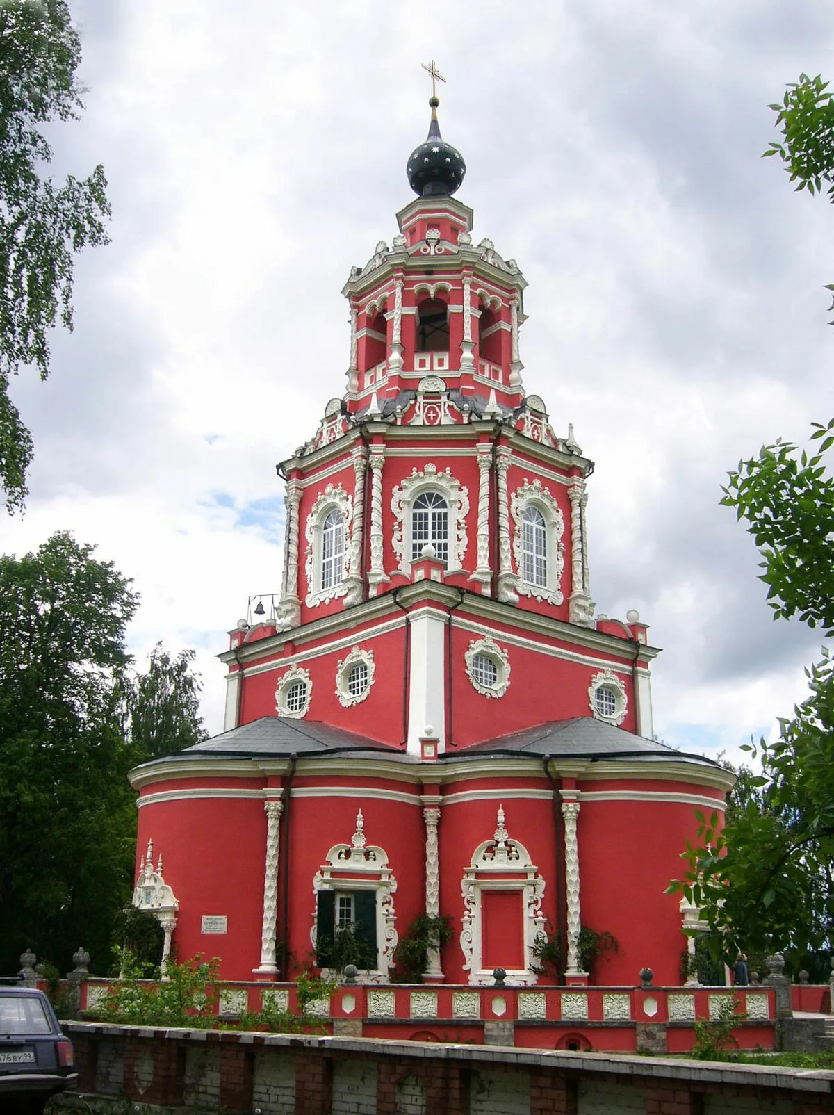 ↑ 尼基特尼基圣三一教堂,位于莫斯科市中央区,建于1628—1653年。最早但也是最为典型的一座,出道即巅峰——疯狂地堆叠呈阶梯状凹陷的半圆形拱券山墙,教堂外墙甚至钟楼帐篷顶上都开满了窗,每扇窗的窗框还都要做出山墙,墙面与棱用白色的柱状浮雕勾边并分隔成单位……再盯着我的眼睛说一边,那实的是供给祈祷办事的处所吗?实不是儿童乐园?(当然金主爸爸尼基特尼科夫自己就是富甲一方、财大气粗的大商人,只能说有钱能使……)