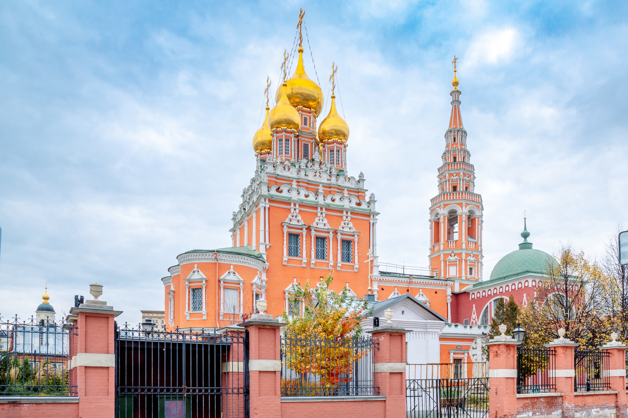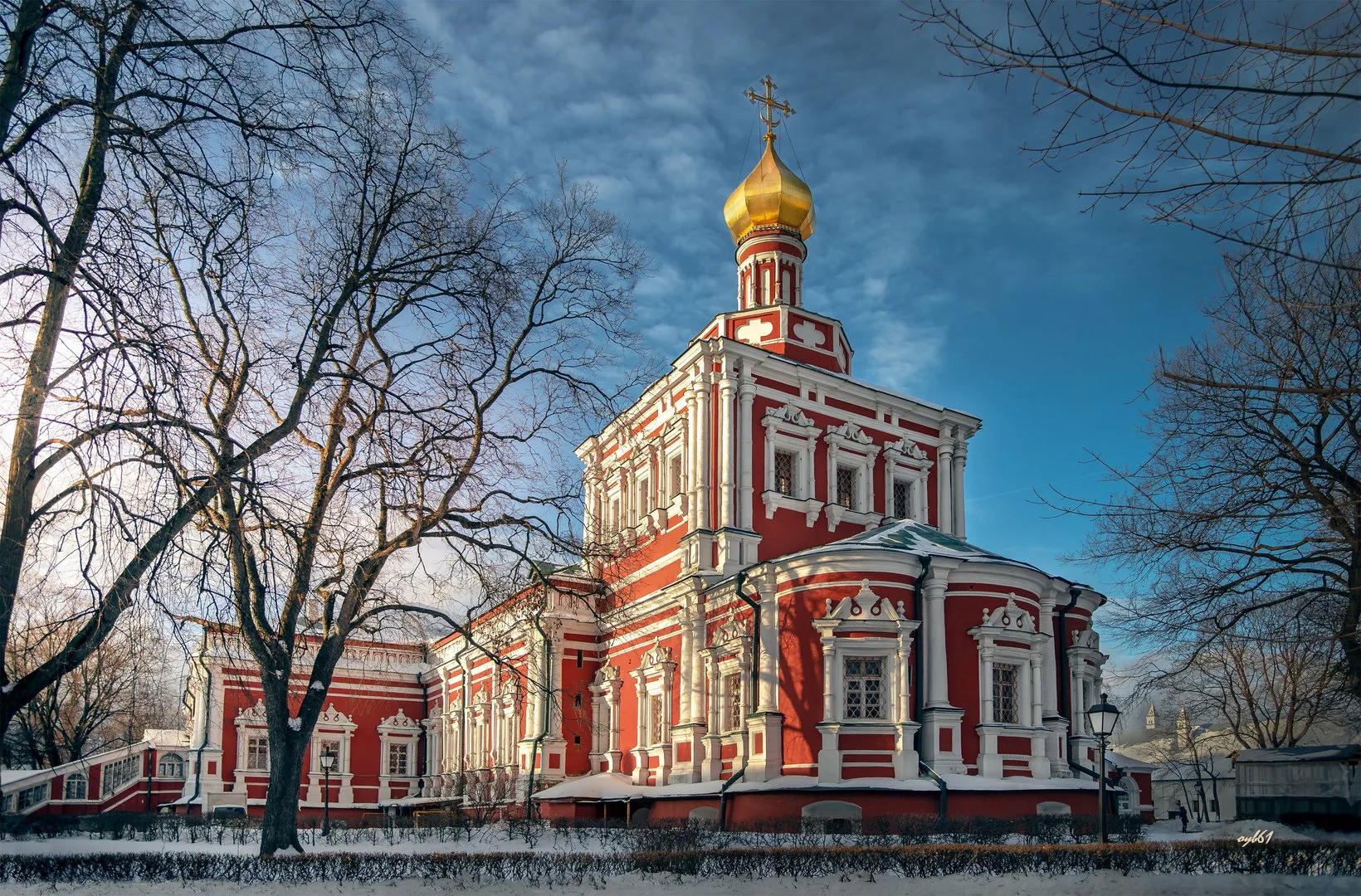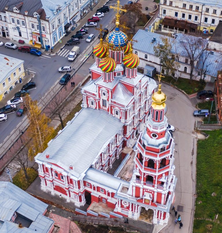 ↑ 尼基特尼基圣三一教堂,位于莫斯科市中央区,建于1628—1653年。最早但也是最为典型的一座,出道即巅峰——疯狂地堆叠呈阶梯状凹陷的半圆形拱券山墙,教堂外墙甚至钟楼帐篷顶上都开满了窗,每扇窗的窗框还都要做出山墙,墙面与棱用白色的柱状浮雕勾边并分隔成单位……再盯着我的眼睛说一边,那实的是供给祈祷办事的处所吗?实不是儿童乐园?(当然金主爸爸尼基特尼科夫自己就是富甲一方、财大气粗的大商人,只能说有钱能使……)