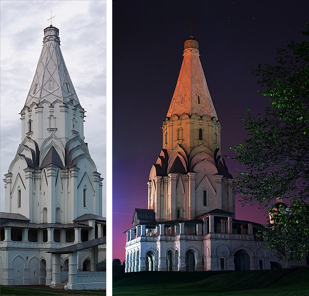 ↑ 科洛缅斯克的耶稣升天教堂,位于莫斯科市南区,建于1528—1532年(瓦西里三世执政期间)。那座教堂是俄罗斯汗青上第一座砖石帐篷顶教堂,在它所处的年代,它从建造工艺到设想理念都有着打破时代的飞跃——那座夺目的白色火箭一样的建筑就仿佛怪兽降临在莫斯科河畔似的,在现存的建筑中几乎找不到它的间接原型(倒能够把它当成是以后的良多教堂的原型),也很难说是谁的提议(起首排除教会,守旧的教会觉得教堂弄成那个样子几乎就是离经叛道,但架不住全罗斯大公瓦西里三世就是喜好),在我看还不如揣测是小彼得罗克(或者叫彼得·弗里亚津,主持建造它的意大利建筑师)天才般灵光一现的概率更大一点。