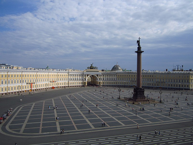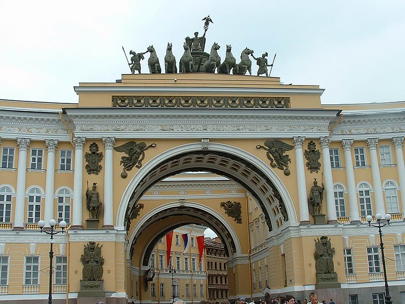 ↑ 海军部大楼,位于圣彼得堡(和冬宫一左一右共享城市核心地带,涅瓦大街的起点),始建于1704—1706年(和彼得保罗要塞一样做为军事建筑兴建——最后那里是造船坞),然后在1806—1823年被改建为俄罗斯古典主义建筑,和上面那张最后版本复原图判若两人,不,两楼,那即是亚历山大一世重金氪下的持重典雅限时限量版新皮肤:古罗马班师门券洞一样的正门与浮雕、建筑主体四角的多立克柱、中央塔楼上的爱奥尼亚柱(不是一面,是一圈)和白色大理石雕像……