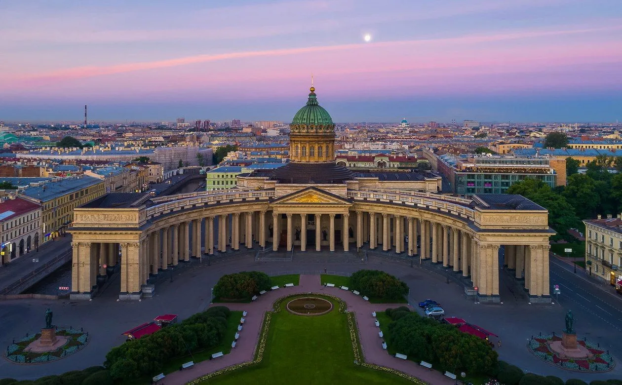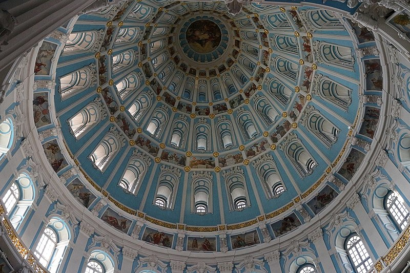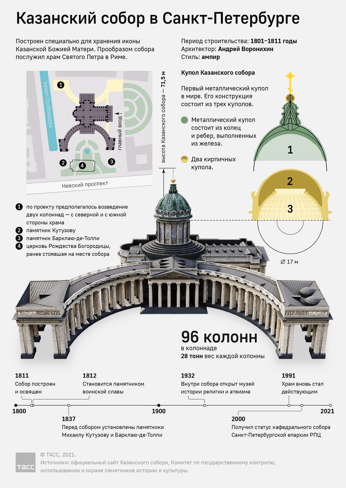 ↑ 喀山大教堂,建于1801—1811年。在圣彼得堡最为荣耀熠熠的若干座大教堂(喀山、圣以撒、滴血、圣彼得与圣保罗、海军圣尼古拉……)之中,它是最早建成的,它的圆顶和此前任何一座东正教堂或宫殿都迥然差别,由铁打造,由肋拱加固(有材料说它是世上第一实拆的金属材量穹顶),宛若对梵蒂冈圣彼得大教堂文艺复兴气概庞大穹顶的无瑕复刻(圣彼得大教堂的穹顶外径42米,几乎等同于罗马万神殿,比君堡圣索菲亚的(32.6米)还大得多,但它是混凝土材量的)。