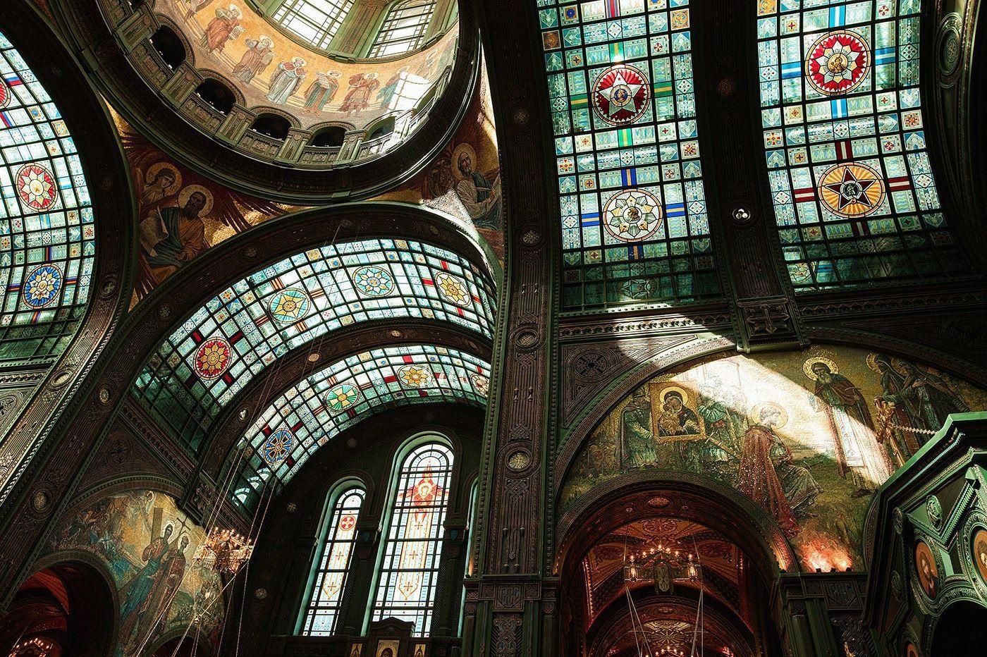 新拜占庭气概大要风行于俄罗斯帝国最初摇摇欲坠的半个世纪。一个巨大、敦朴的单体圆顶,不是洋葱头,没有帐篷顶支持,下面是一圈细长的拱形窗户,以致于觉得像有一张伞形能量防护罩在建筑上撑开——那恰是拜占庭气概元祖圣索菲亚大教堂的构造特征。