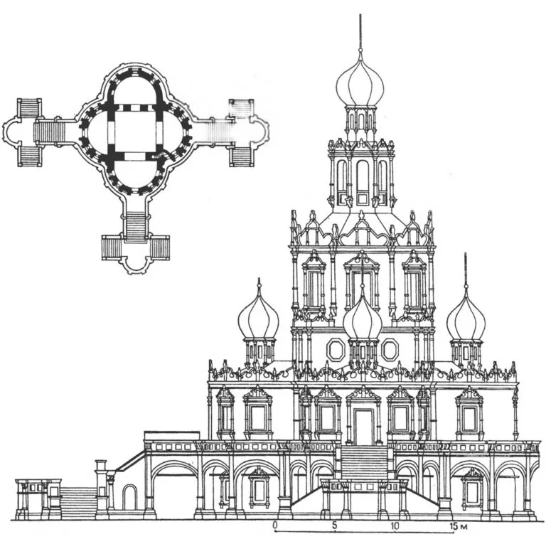 为什么说那些呢,因为教堂建筑里面有个子类型叫восьмерик на четверике,描述的是整座教堂的构造特征:方盒子或十字形建筑主体,上面叠加一层(或好几层)有八个侧面的构造,此中最上面一层可能是帐篷顶也可能仍是八棱柱,撑着洋葱头和十字架(也有个此外只要十字架)。底子没法把那个并系群划归到某个气概底下去。