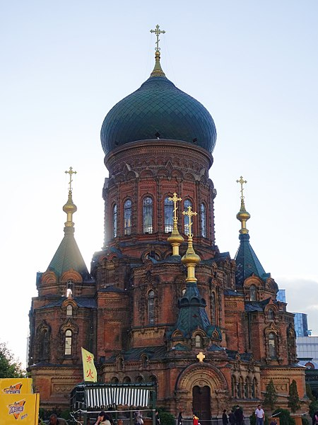 ↑ 哈尔滨的圣索菲亚大教堂就是一座溢出到我国境内的新拜占庭气概教堂(固然不像其他的那么典型)。目前的版本建于1923—1932年,想必是出自外逃俄国侨民之手,现在那里被称做哈尔滨建筑艺术馆,属于人民政府。