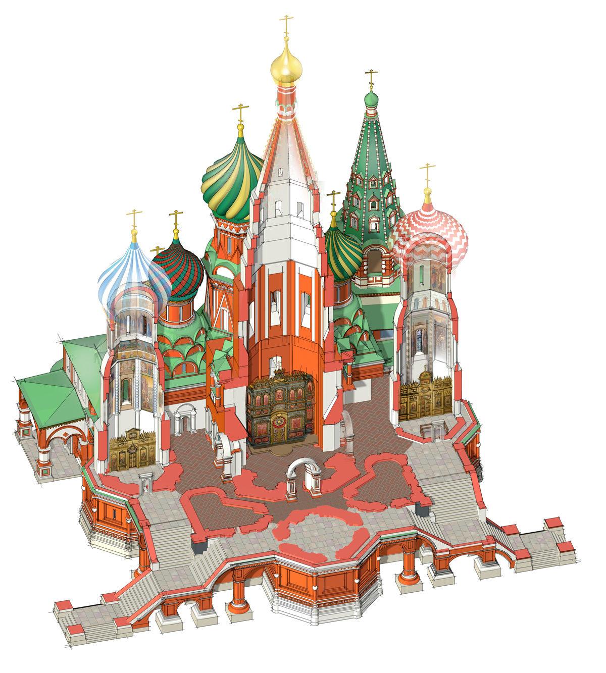 ↑ 那是国度汗青博物馆官网上的教堂3D导览(就像前面提到的,如今它一边照旧举行东正教仪式,一边承担国度汗青博物馆分馆的本能机能)。官网(俄语):Храм Василия Блаженного (Покровский собор)