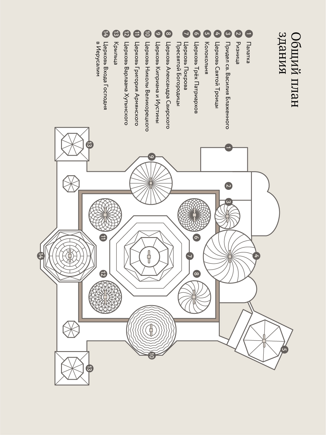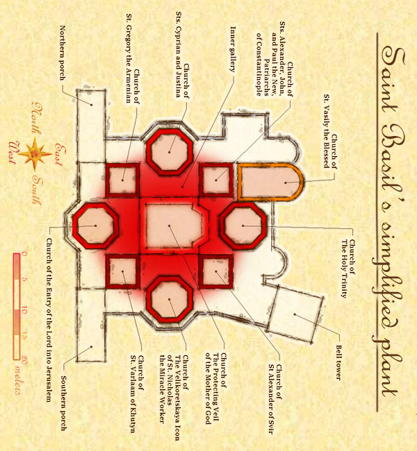 前面我提到,圣瓦西里大教堂现实上是11座教堂(церковь级别)合体进化而成的,如今我来简要阐发一番,为了契合上北下南的方位习惯,有的材料图我扭转了一下。