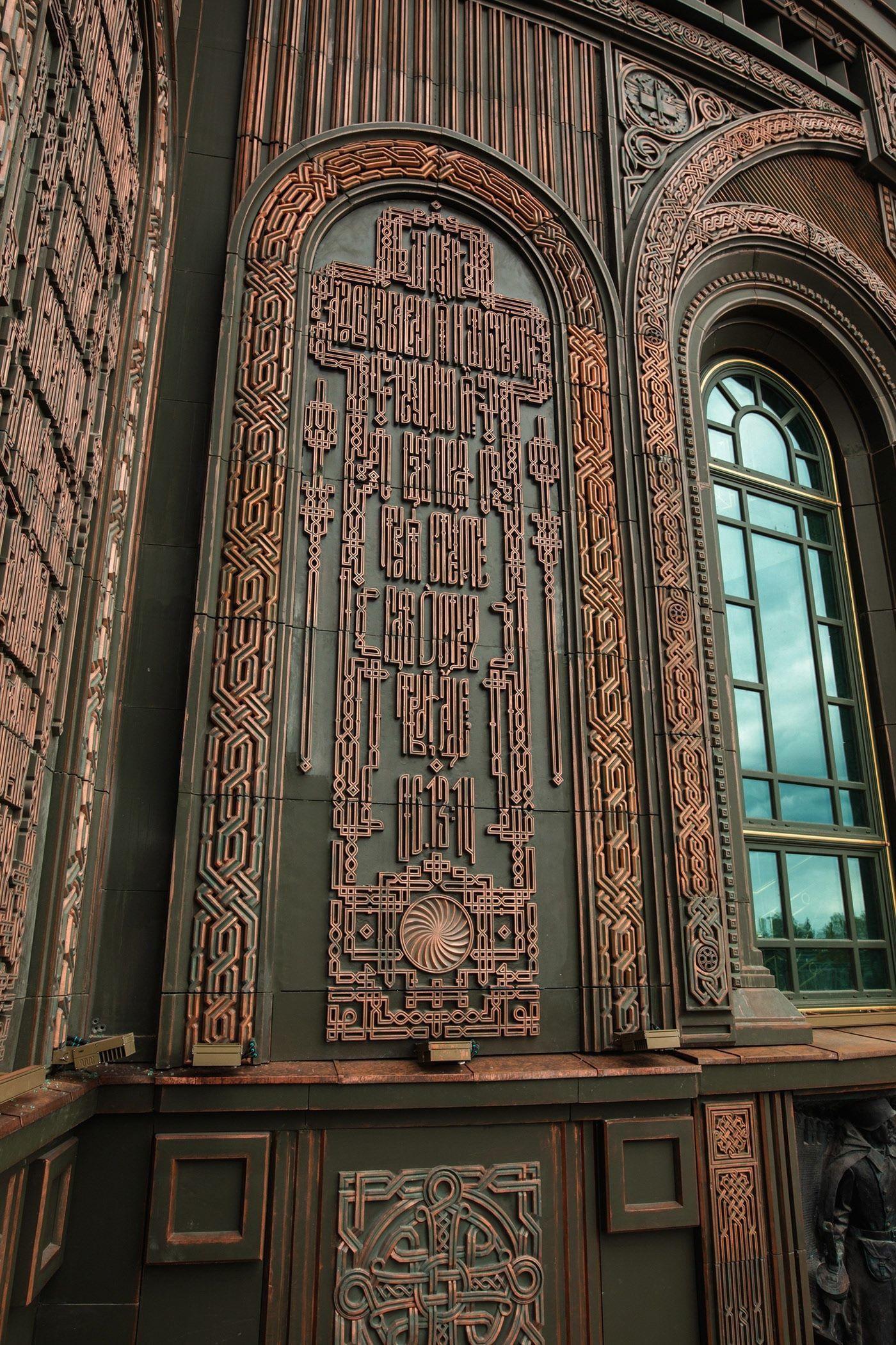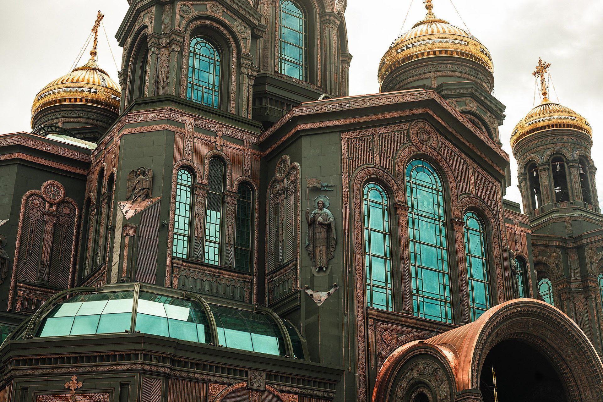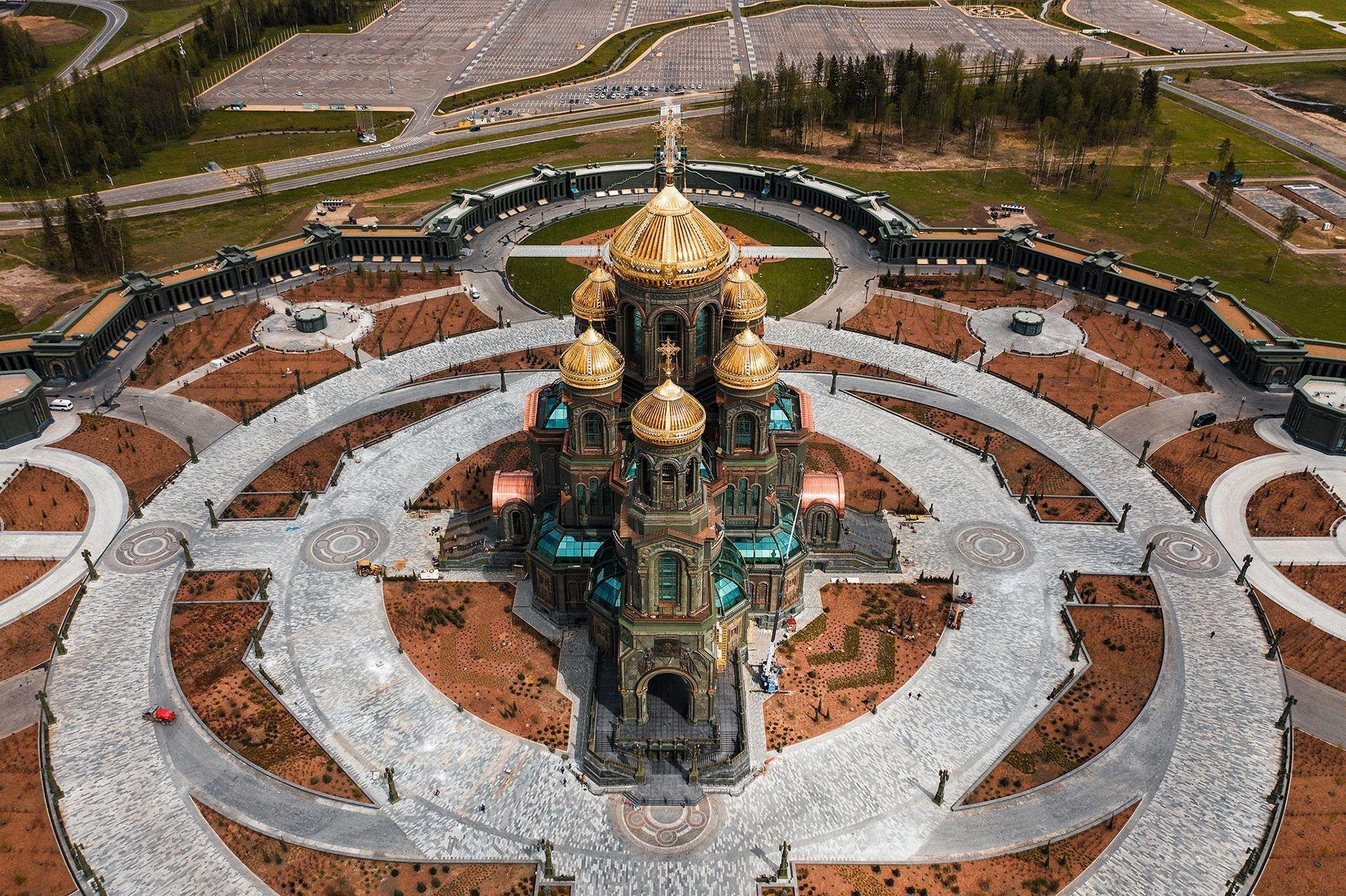 ↑ 俄罗斯联邦武拆力量总教堂(起个简单的名字,俄军堂),位于莫斯科州奥金佐沃区库宾卡,建于……2018—2020年,对,前年的伟大的卫国战争(二战)成功75周年献礼。那是世界第五大的东正教堂欸,耗时两年,几乎是一眨眼的功夫,就建成了,那就是现代建筑工业的力量吗?并且从外墙到内饰都是以现代思维精心筹谋的,粉饰图案细细辨认才气发现是古斯拉夫花体字母铭写的圣经经文,玻璃窗的图案是各类苏联勋章……
